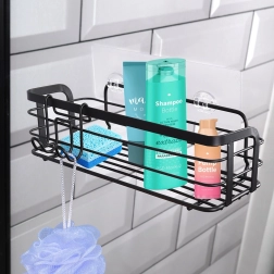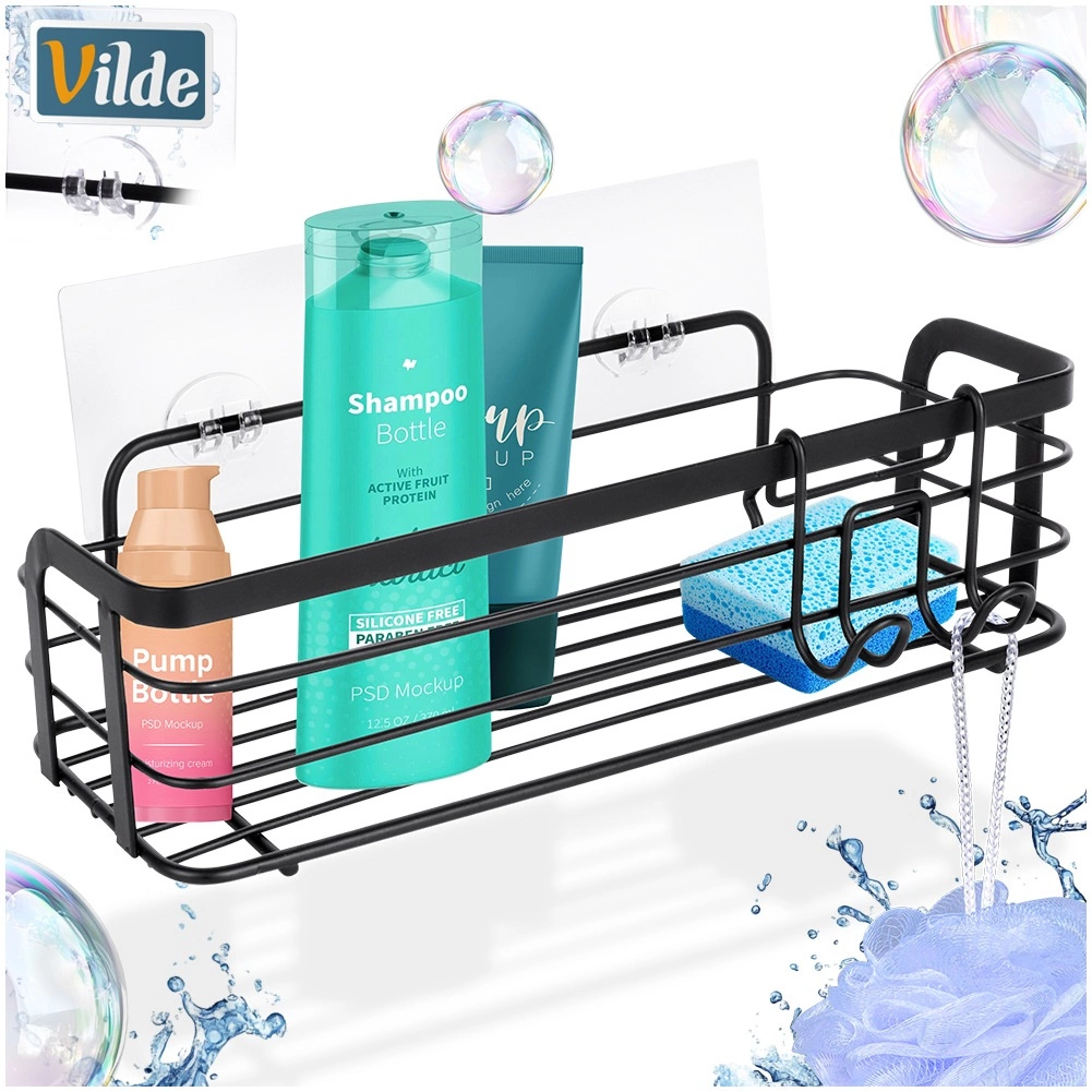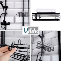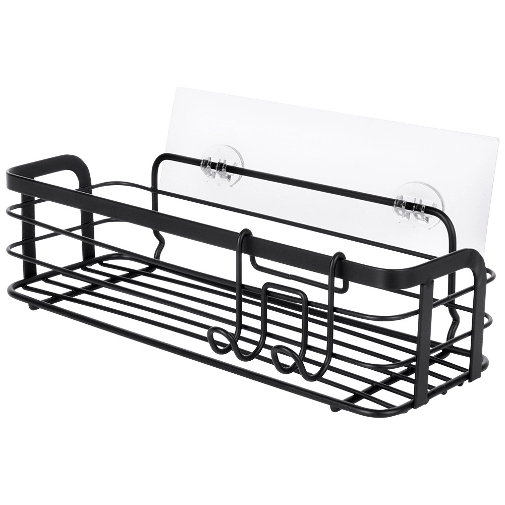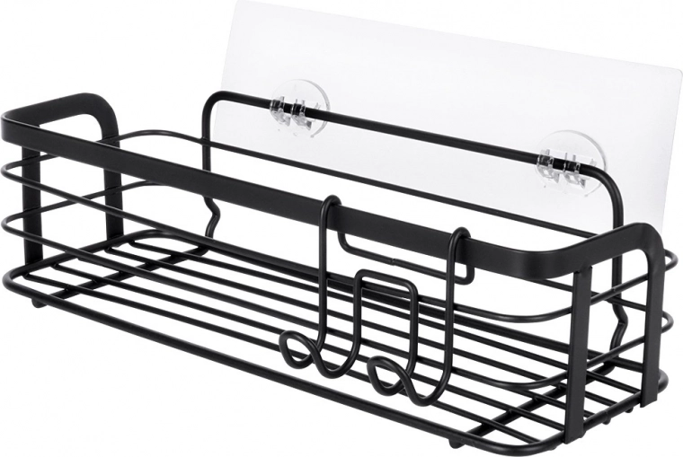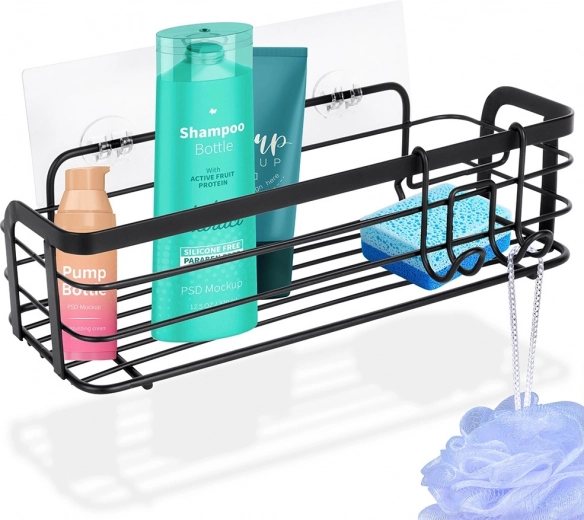 Praktische zelfklevende doucheplank van duurzaam metaal in matzwart. Biedt voldoende ruimte voor shampoos, gels en cosmetica, heeft een eenvoudige installatie zonder boren en wordt geleverd met een afneembare hanger met twee haken voor accessoires. Roestvrije afwerking, makkelijk te reinigen en universeel toepasbaar in badkamer en keuken.