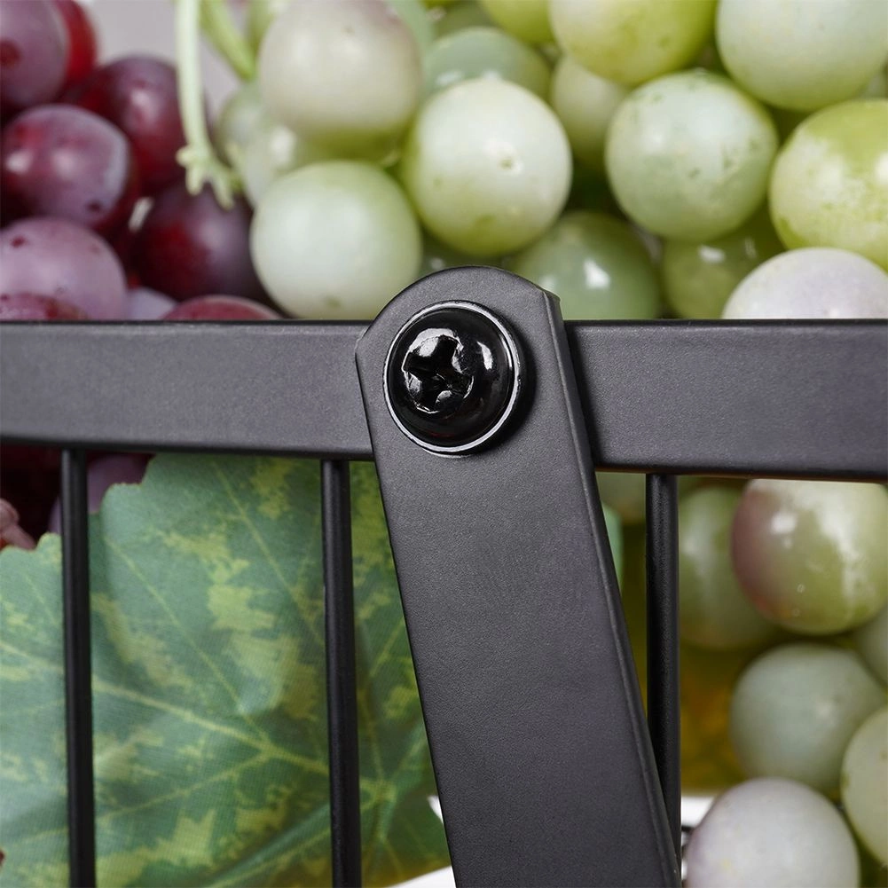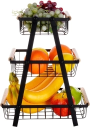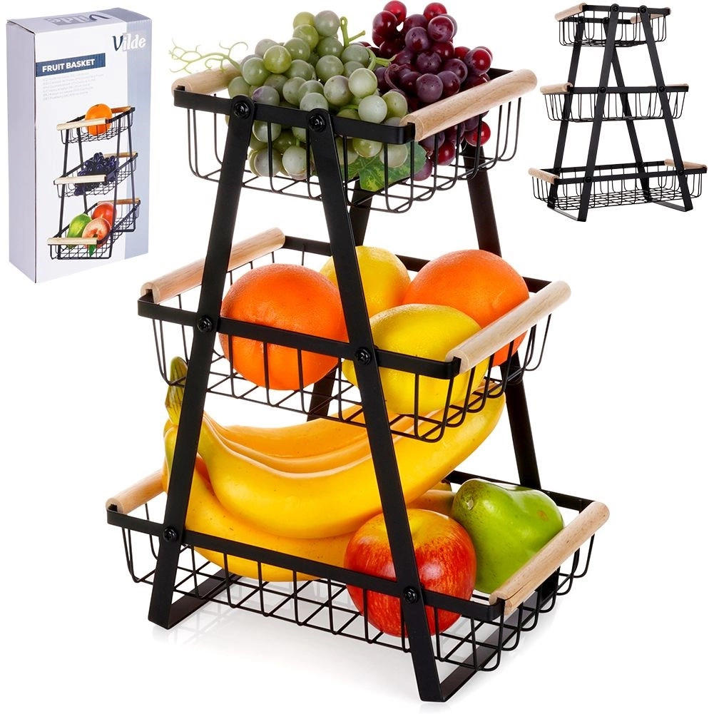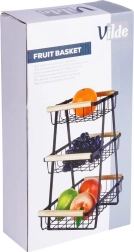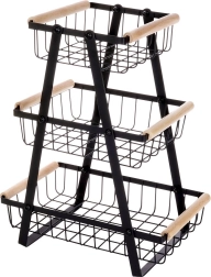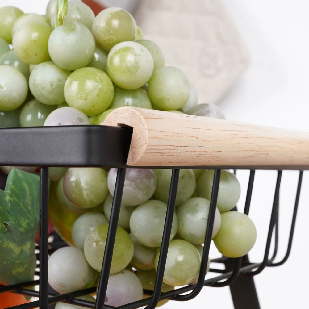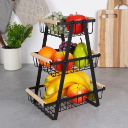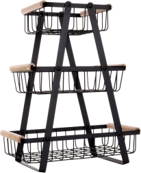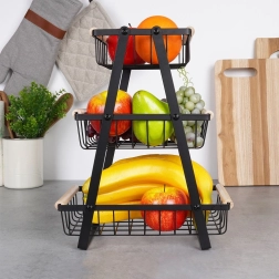 Deze driedelige fruit- en groentestandaard biedt slimme verticale opslag en bespaart zo ruimte op het aanrecht en in de voorraadkast. De open manden zorgen voor betere luchtstroom, waardoor etenswaren langer vers blijven en altijd in het zicht zijn. Het robuuste metaal in matzwart wordt aangevuld met prettige houten handgrepen voor comfortabel dragen.