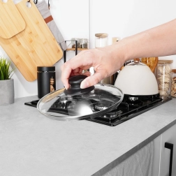 Dankzij het transparante glas kunt u het kookproces comfortabel volgen en warmteverlies minimaliseren. De geïntegreerde ontluchtingsopening voert overtollige stoom effectief af, wat overkoken en vervuiling van de kookplaat helpt voorkomen. De hoge rand zorgt voor een nauwe aansluiting op de rand van de pan en vermindert spatten.