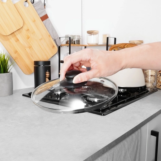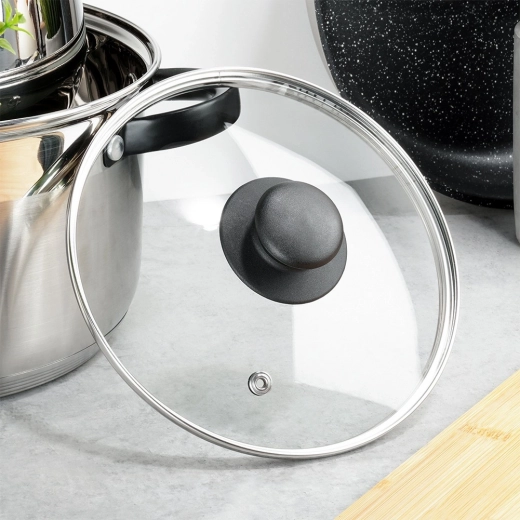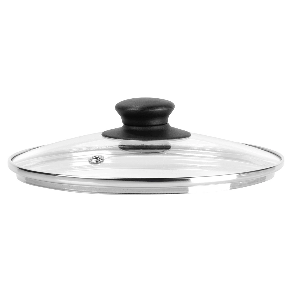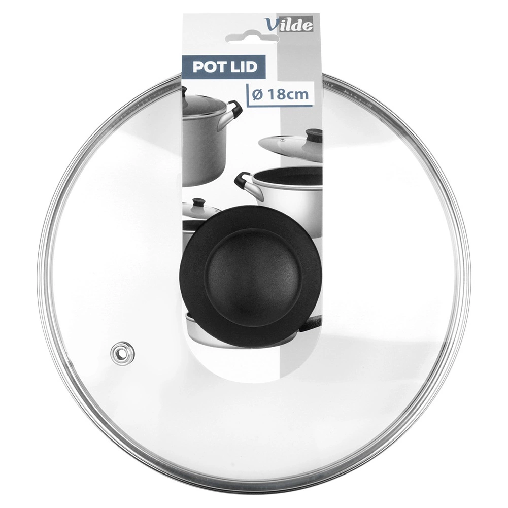 Het glazen deksel van 18 cm is een praktische aanvulling voor potten, pannen en saus pannen met dezelfde diameter. Het is gemaakt van hittebestendig, transparant glas met een roestvrijstalen rand en een duurzame kunststof knop in het zwart. De transparante constructie maakt controle mogelijk zonder het deksel op te tillen, wat zowel energie als tijd bespaart.
