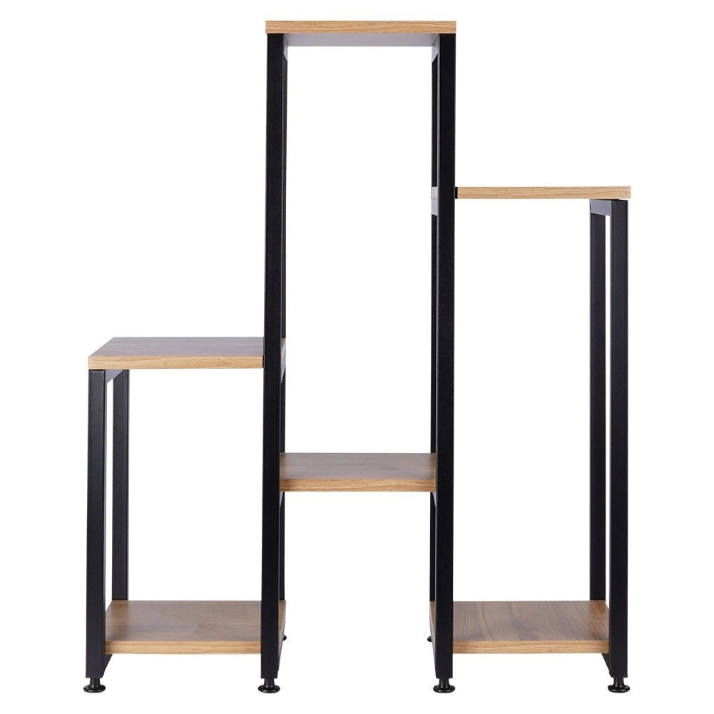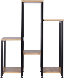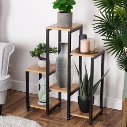 Stijlvolle plantenstandaard in een modern industrieel design met 6 legplanken op 5 hoogteniveaus, ideaal voor planten en decoraties. De robuuste metalen constructie in het zwart en MDF-planken met houtdecor zorgen voor stabiliteit en lange levensduur. Dankzij de compacte afmetingen van 62 × 24 × 80 cm en een draagvermogen tot 60 kg past hij in woonkamer, keuken, hal en kantoor.