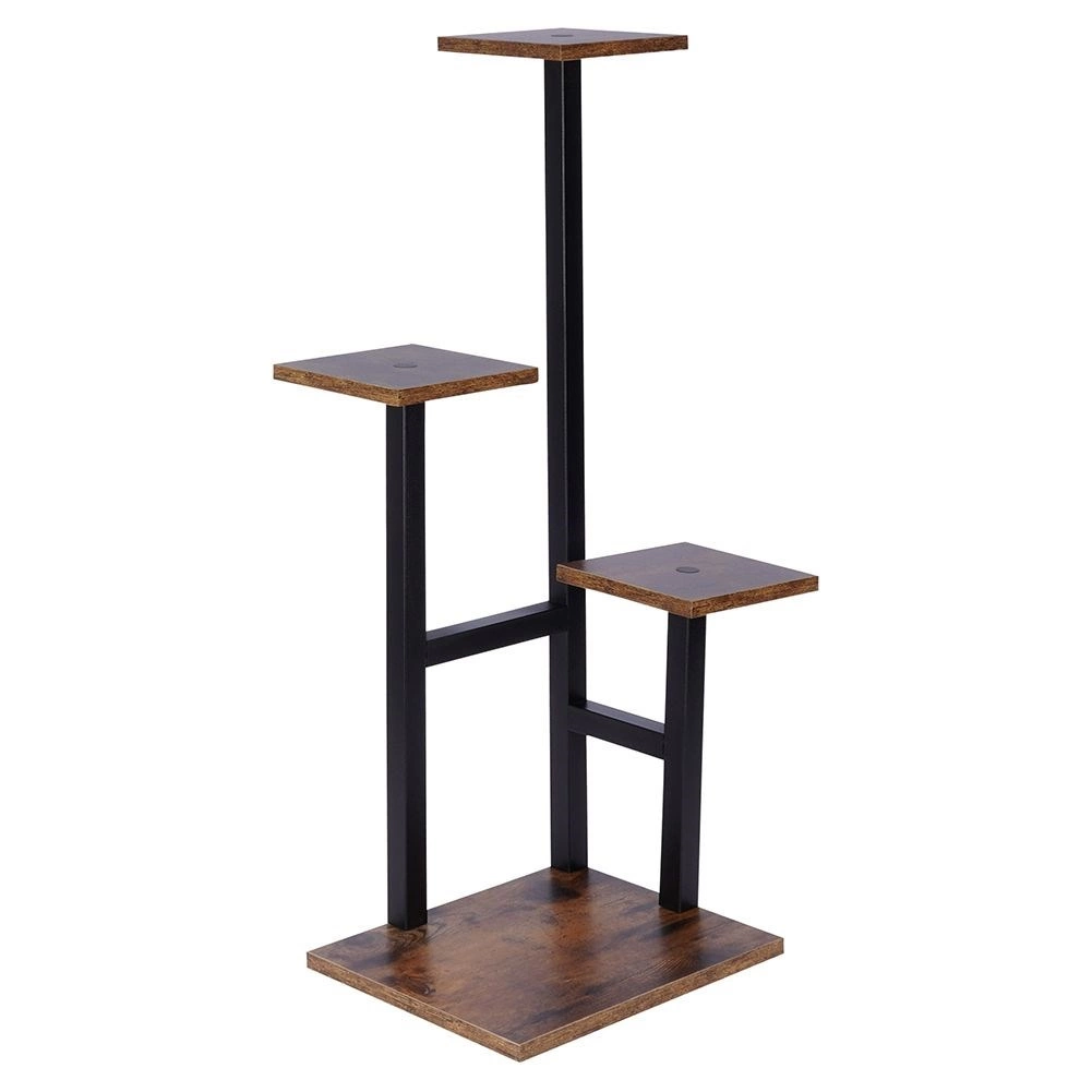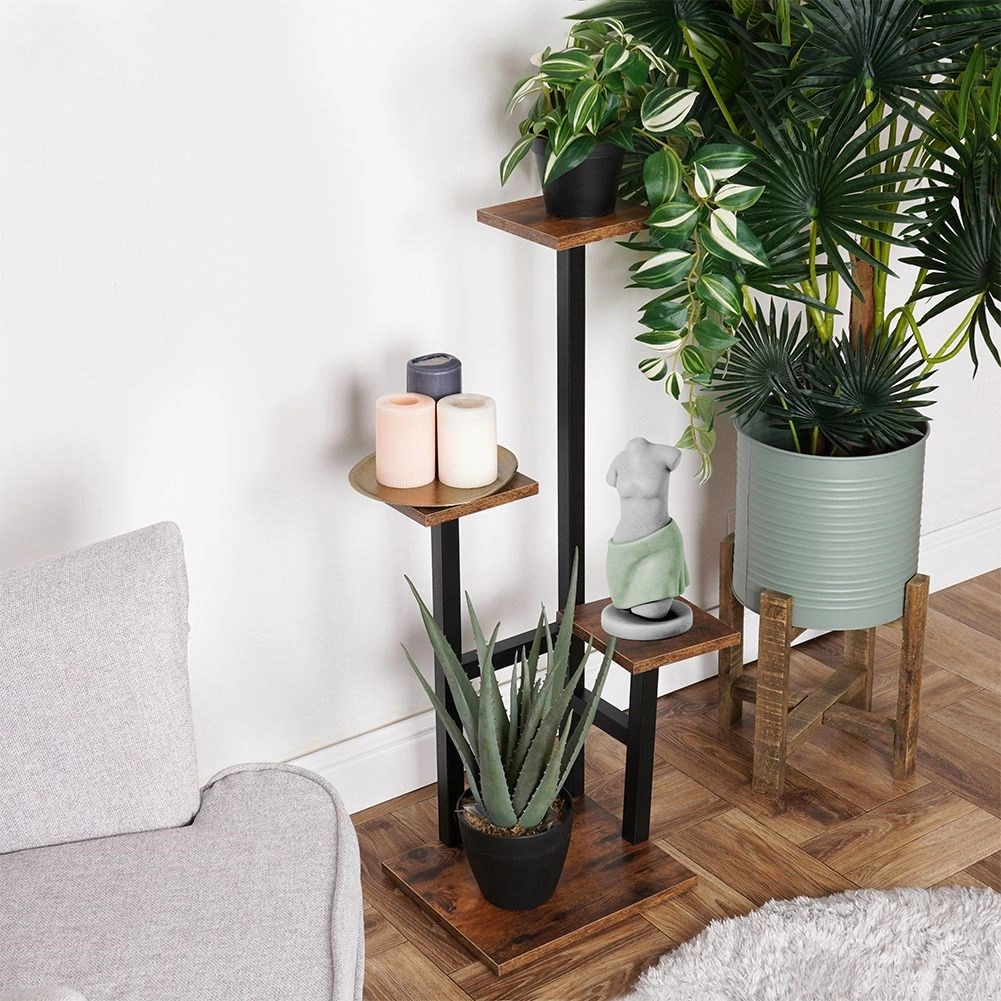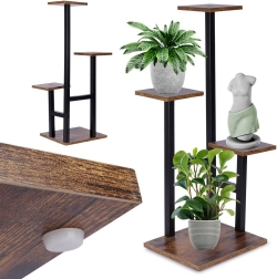 Deze meerlaagse plantenstandaard combineert een zwarte metalen constructie met MDF-planken in donker houtdecor. Het getrapte design maakt het mogelijk meerdere planten effectief te presenteren op een klein oppervlak en zo een aantrekkelijke groene compositie te creëren in elk interieur.
