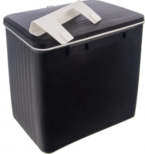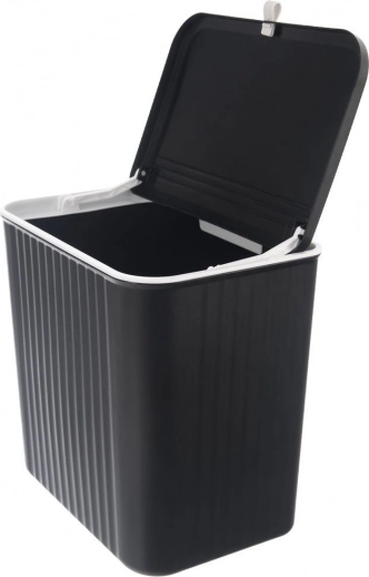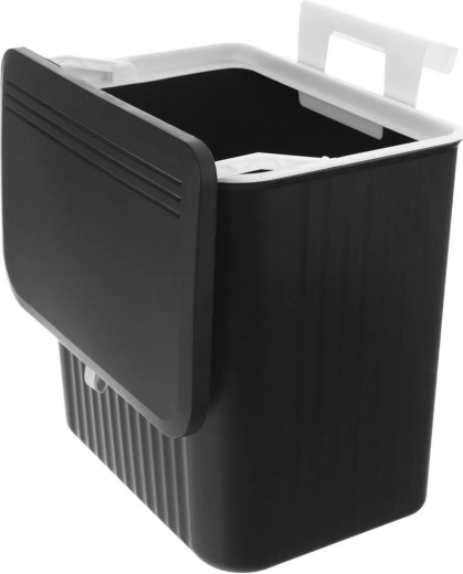 Praktische hangende vuilnisbak met een inhoud van 13 l voor keuken en huishouden. Kan aan kastdeurtjes worden gehangen, aan de muur worden gemonteerd of klassiek onder de gootsteen worden geplaatst. Heeft twee manieren om het deksel te openen voor snel wegvegen van restjes en een afsluitbaar deksel tegen geurtjes. Duurzame uitvoering van hoogwaardige kunststof in zwart met een comfortabele witte greep.