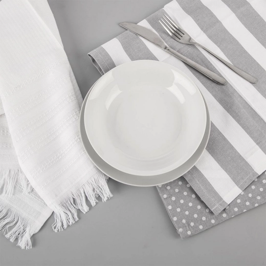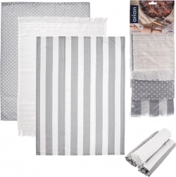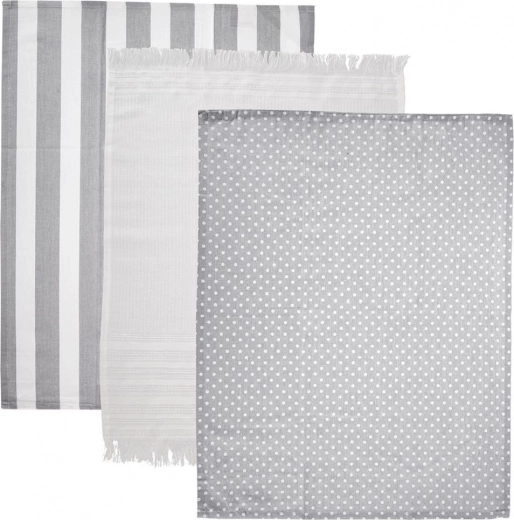 Set van 3 hoogwaardige katoenen doeken in moderne patronen – strepen, stippen en effen wit met franjes – past perfect in elke keuken. Dankzij 100% katoen excelleren ze in absorptie en zijn ze zacht aan de aanraking, terwijl ze stevig en duurzaam blijven voor dagelijks gebruik.