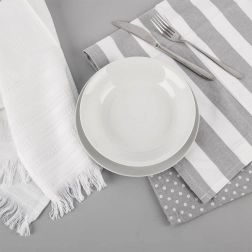Strepen, stippen en een effen witte doek zijn makkelijk te combineren en geven de keuken een elegante uitstraling.