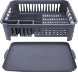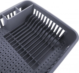 Het rek biedt plaats aan tot 12 borden, heeft ruimte voor kommen, mokken en glazen en een bestekbak met twee vakken voor een overzichtelijke organisatie. Dankzij de neutrale grijze kleur past het gemakkelijk bij elke keukenstijl en is het onderhoudsvriendelijk – haal de bak eruit en spoel af.