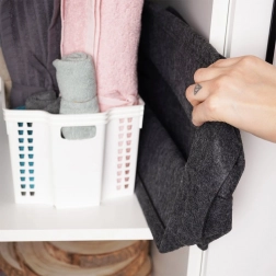De moderne, strakke look in zwarte kleur past in de woonkamer, slaapkamer, kinderkamer en badkamer. De opvouwbare uitvoering laat de mand in een handomdraai plat opvouwen om ruimte te besparen wanneer hij niet nodig is.