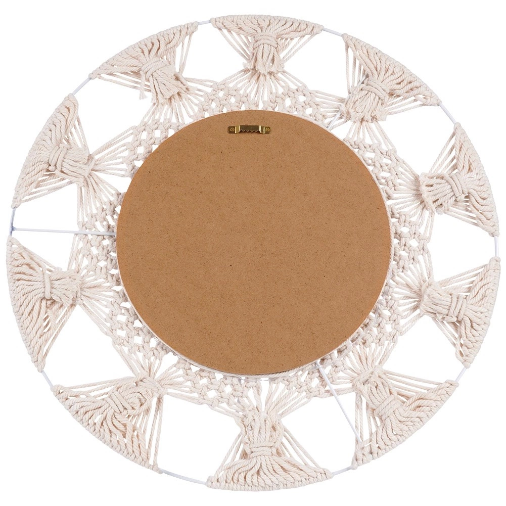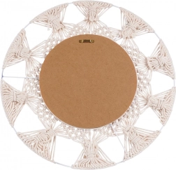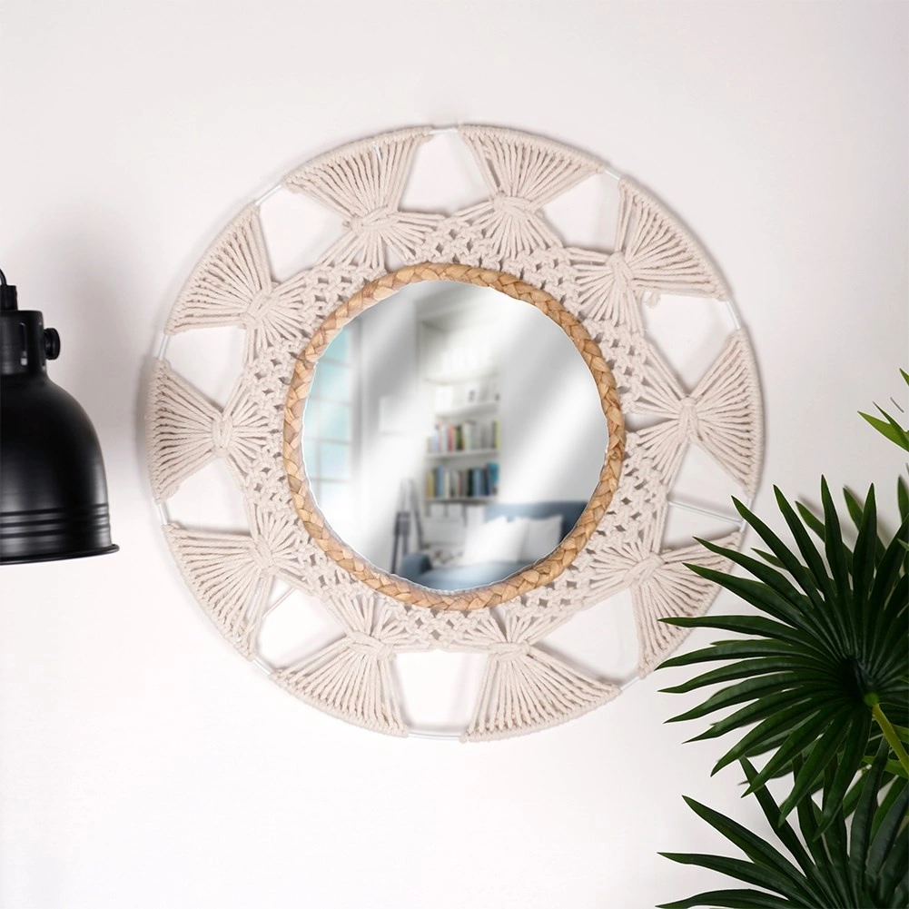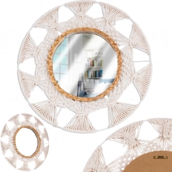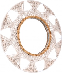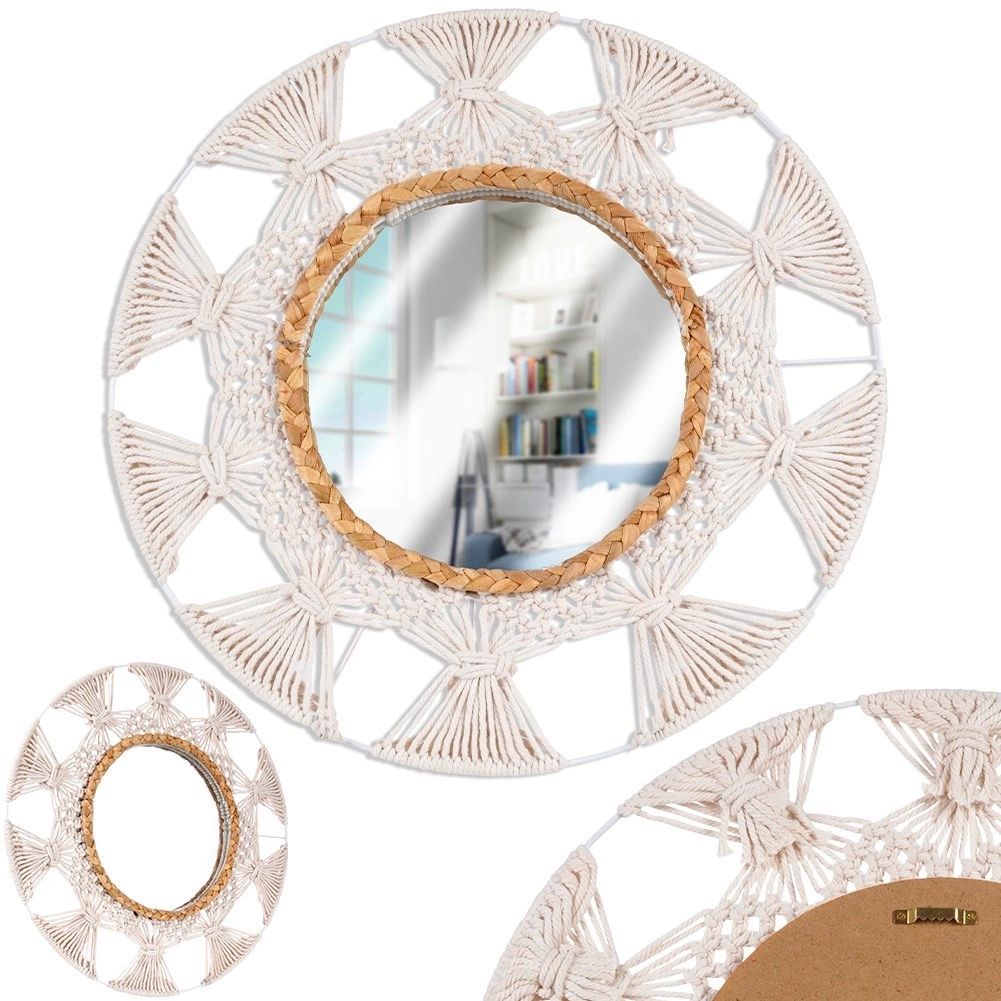 Breng lichtheid en gezelligheid in je interieur met deze ronde spiegel in geliefde boho-stijl. De combinatie van een beige katoenen vlechtwerk in macramé-look en een decoratieve ring van zeegras creëert een uniek accent aan de muur. De spiegel biedt een scherpe en natuurlijke weergave en fungeert zowel als praktisch element als decoratieve blikvanger.