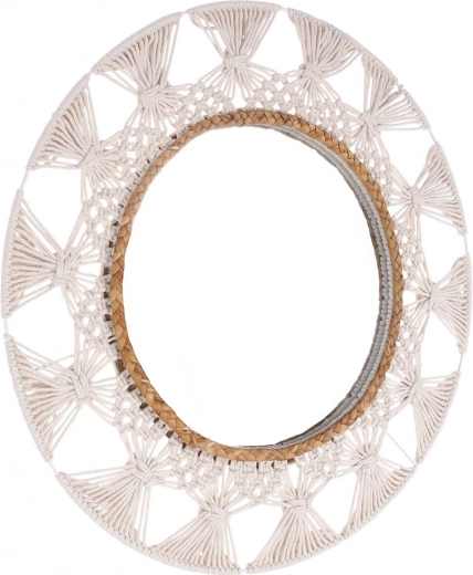 Stijlvolle ronde wandspiegel met een diameter van 55 cm en een decoratieve macramé lijst van katoentouw en zeewier, geeft je interieur een boho-touch, verheldert optisch en vergroot de ruimte, en zorgt dankzij het hoogwaardige spiegelglas voor een heldere en scherpe reflectie.