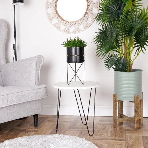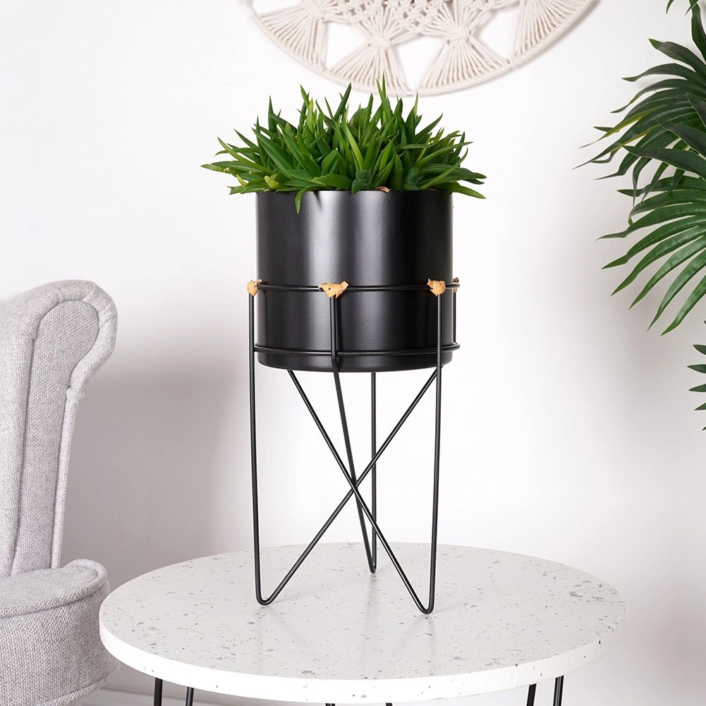 De design plantenpot in zwart met draadstandaard komt tot zijn recht in zowel moderne als klassieke interieurs. De metalen pot kan eenvoudig uit de standaard worden genomen en verplaatst. Dankzij de verhoogde positie komen planten beter tot hun recht en profiteren ze van natuurlijke luchtcirculatie.