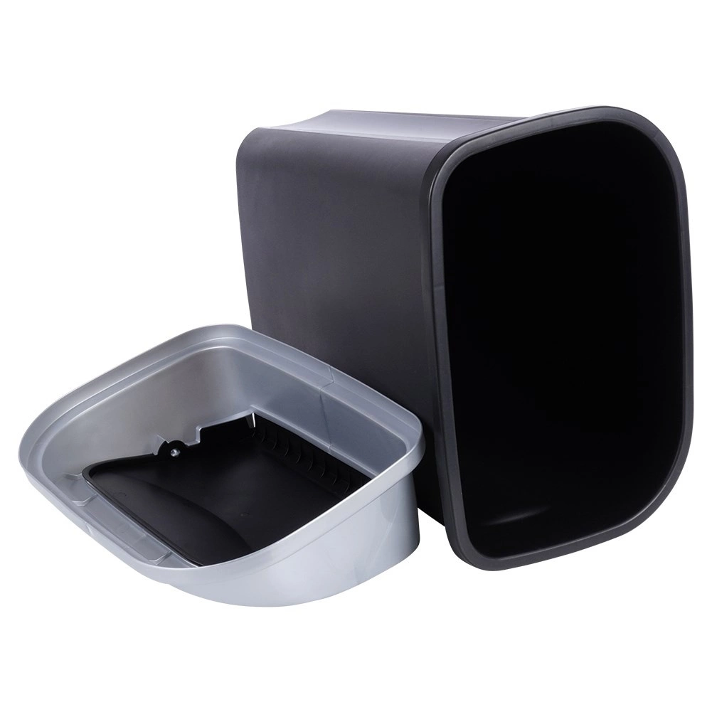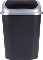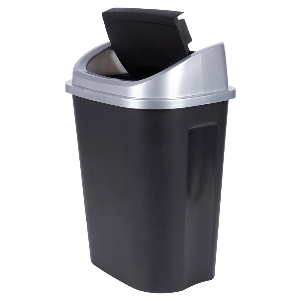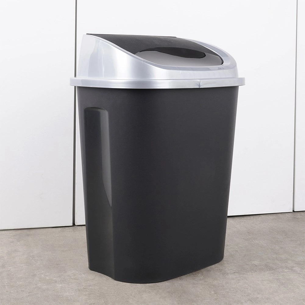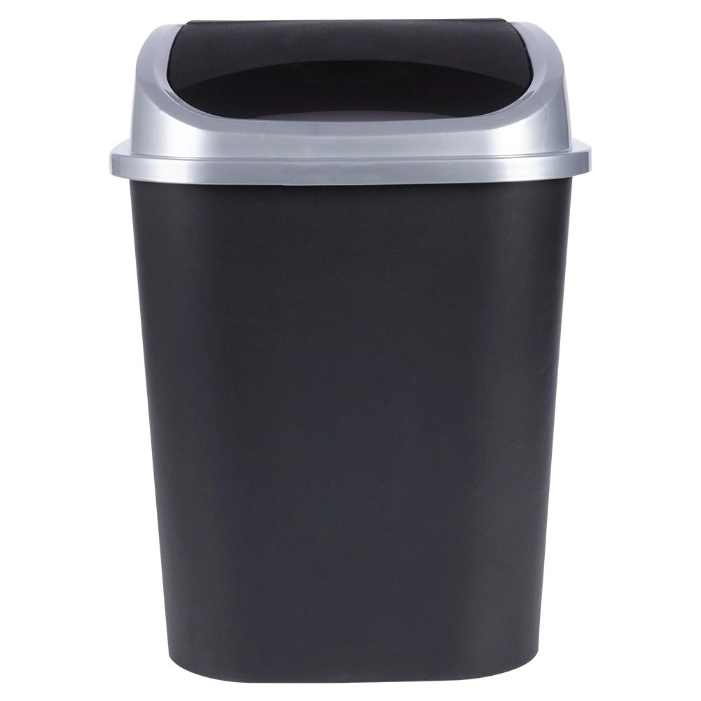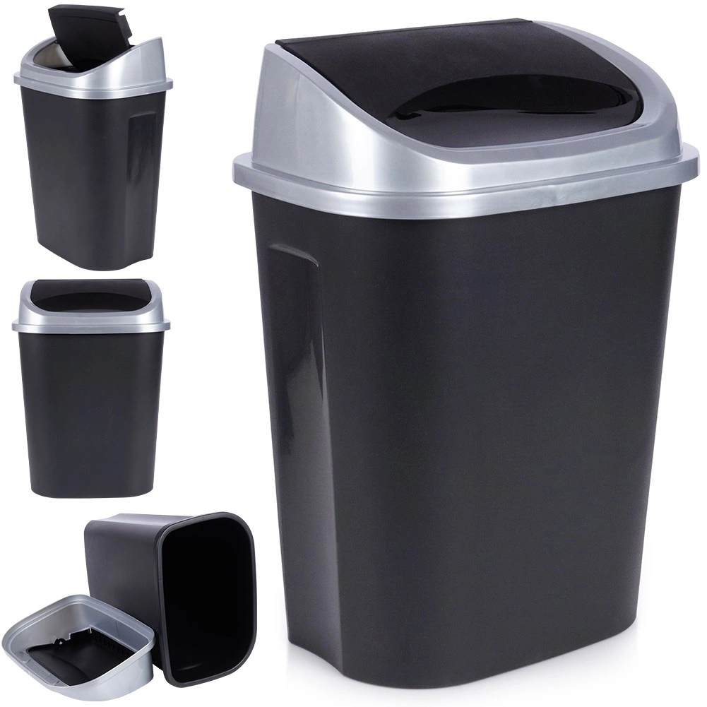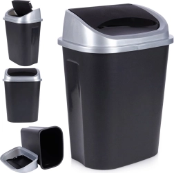 Praktische afvalbak met een mat zwarte behuizing en een zilverkleurige rand rond het deksel, perfect voor thuis en op kantoor. Het klapdeksel maakt eenvoudig en schoon weggooien mogelijk, terwijl het afneembare bovendeel het vervangen van zakken en reinigen vergemakkelijkt. Dankzij de compacte afmetingen kan hij op de vloer worden geplaatst of in een kast worden verborgen.