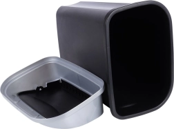 Stevig plastic in mat zwart met een zilverkleurige rand is zowel duurzaam als licht. Geïntegreerde handgrepen aan de zijkant vergemakkelijken het dragen en legen.