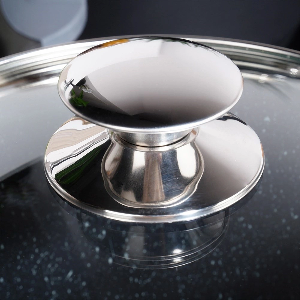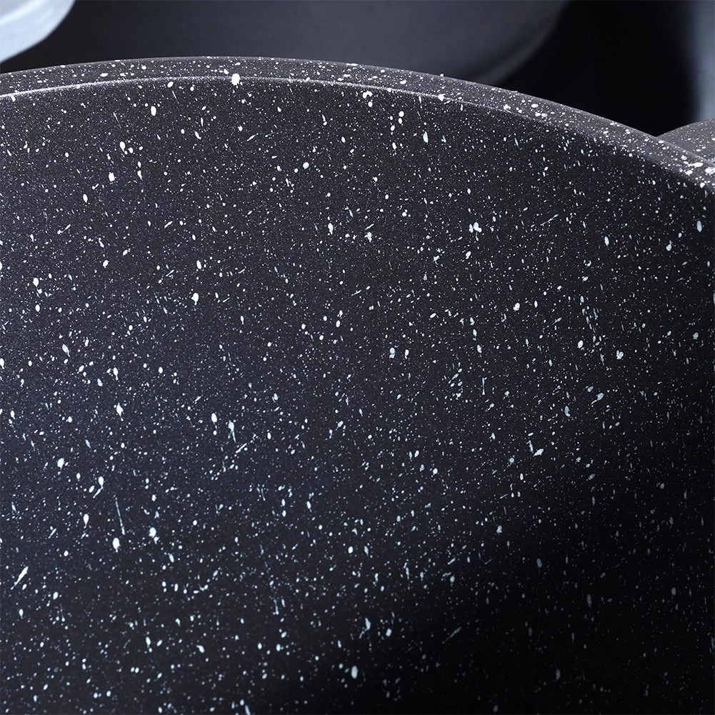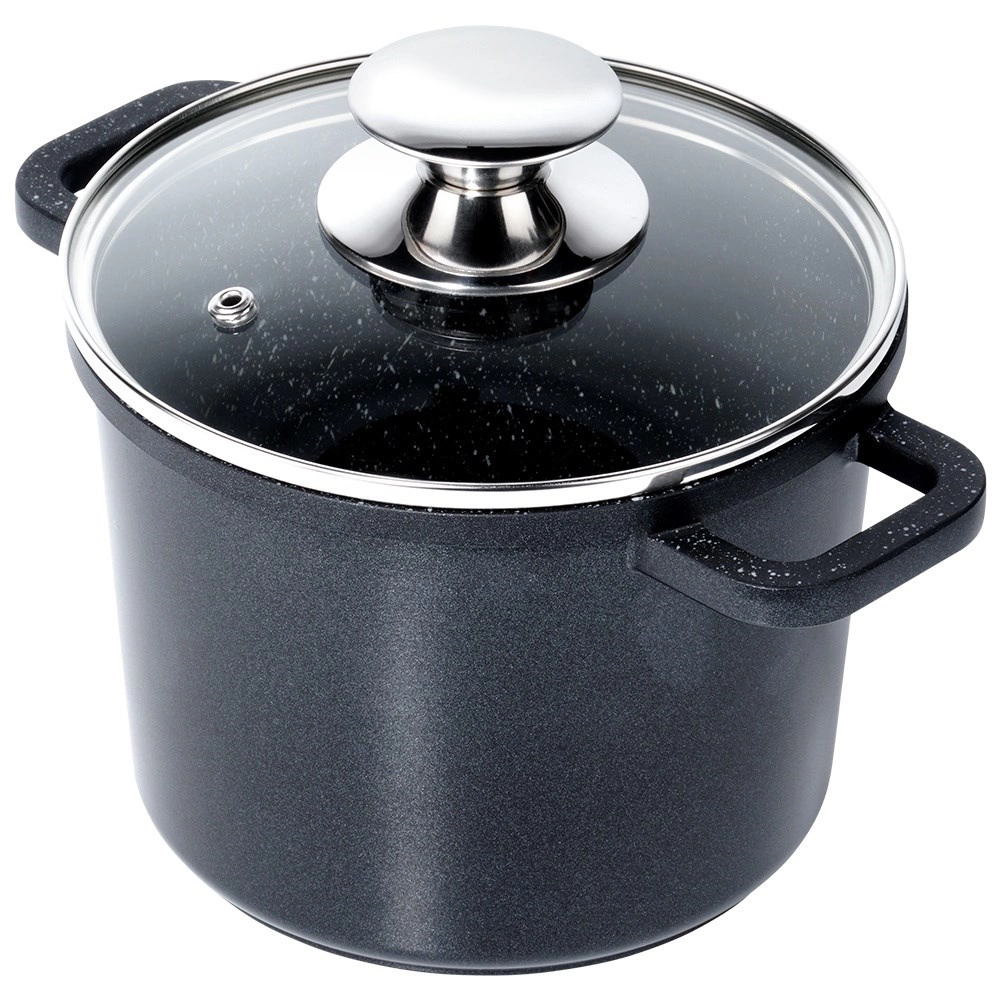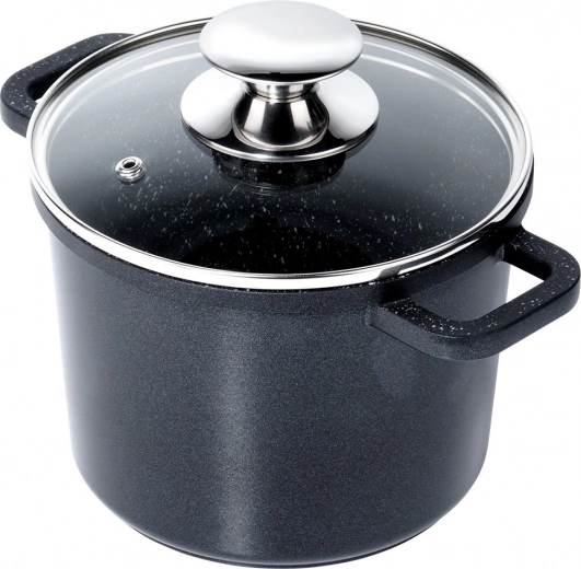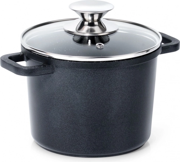 Elegante pan van zwart aluminium met een interne granieten antiaanbakcoating PFLUON zorgt ervoor dat voedsel niet aanbrandt, makkelijker te reinigen is en zijn natuurlijke smaak en voedingsstoffen behoudt. Het glazen deksel met steam vent opening maakt controle mogelijk zonder onnodig optillen.