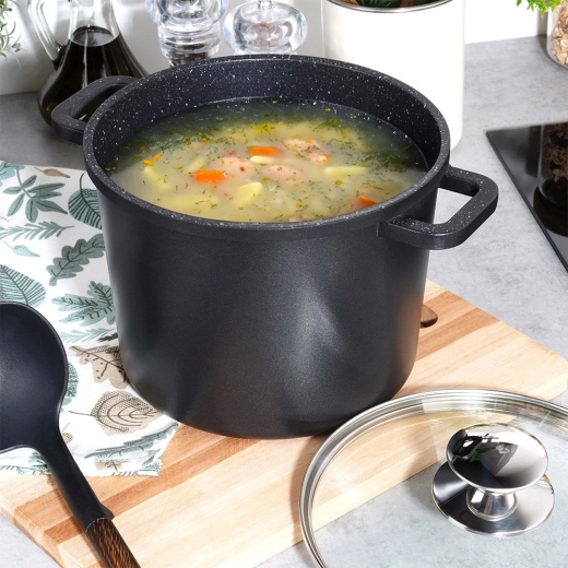 De pan is ideaal voor soepen, sauzen en one-pot gerechten. Robuuste zijgrepen vergemakkelijken het hanteren, terwijl de moderne zwarte look mooi uitkomt in elke keuken en ook aan tafel bij het serveren. De constructie zorgt voor snelle en gelijkmatige verwarming, waardoor tijd en energie worden bespaard.