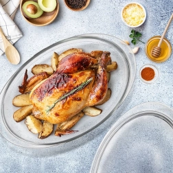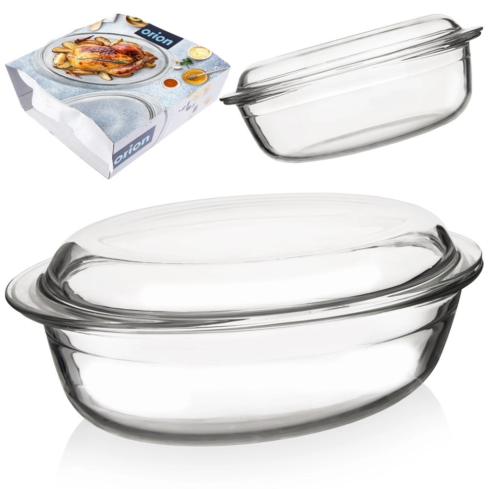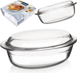Beheers thuis bakken met een ovale glazen schaal met deksel met een inhoud van 3 l. Gemaakt van borosilicaatglas, bestand van -20 °C tot +300 °C, geschikt voor oven en magnetron, met eenvoudige reiniging in de vaatwasser. De twee delen kunnen apart of samen worden gebruikt – het deksel dient als tweede ovenschaal.