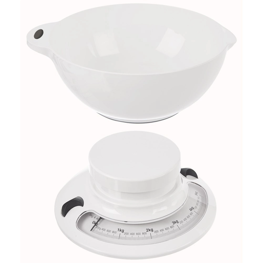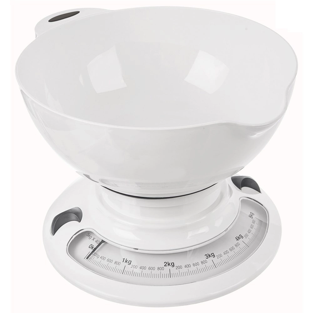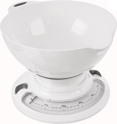 Praktische mechanische keukenweegschaal met afneembare kom en een draagvermogen van 5 kg voor nauwkeurig afwegen van ingrediënten. Biedt duidelijke analoge meting in g/kg en lbs/oz, nulstelling/tarra, een stabiele basis met antislip en een kom met een inhoud van 2,6 l met een praktische uitgiettuit. Geen batterijen nodig – een betrouwbare en milieuvriendelijke hulp in elke keuken.