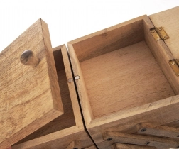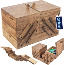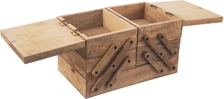 Het zorgvuldig afgewerkte hout is handgemaakt, vochtbestendig en vormvast. Twee bovenkleppen met houten knoppen zorgen voor snel en comfortabel openen. Binnenin vind je 5 praktische vakken – vier vierkante aan de zijkanten en één grote rechthoekige onderin – ideaal voor het segmenteren van naaibenodigdheden, kralen of klein gereedschap.