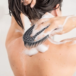 Eén zijde met langere siliconen borstelharen voor effectief afwassen, de andere met massage-noppen voor zacht schrobben en een ontspannende huidmassage.