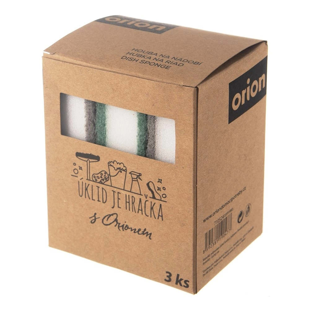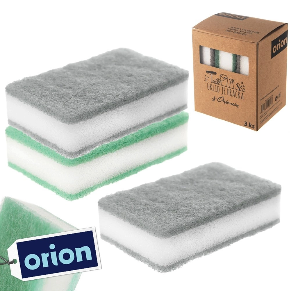 Drie-laagse keukensponsjes combineren zacht schuim met een stevige schurende laag voor effectief verwijderen van vuil zonder oppervlakken te beschadigen. In de verpakking zitten twee grijze en één groene spons, geschikt voor het afwassen en het schoonmaken van keukenoppervlakken.