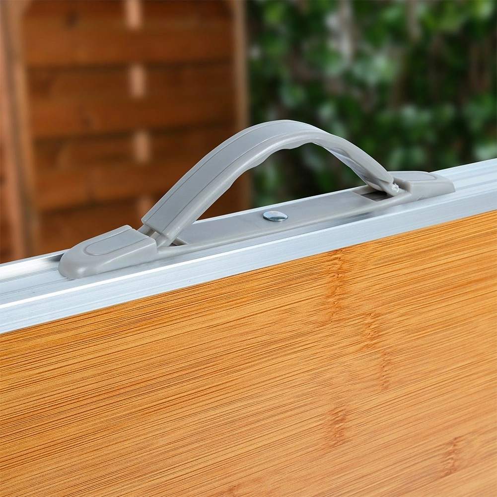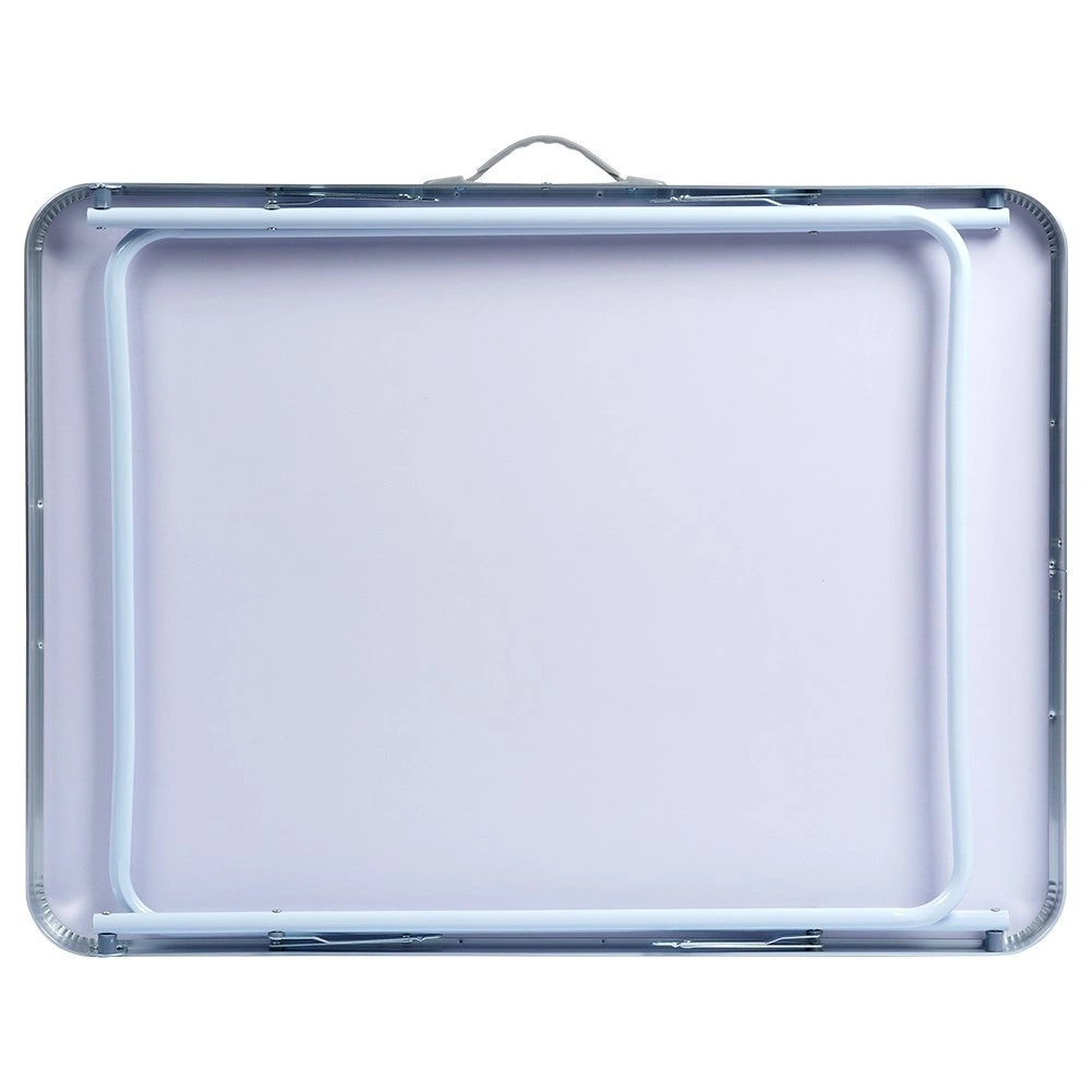 Ingevouwen heeft de tafel een plat formaat en een praktisch handvat voor comfortabel dragen. Ideaal voor kamperen, picknick en reizen.