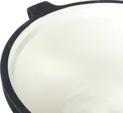 Het deksel is uitgerust met een ontluchtingsopening en twee nastelbare schroeven voor een zekere afsluiting. De ketel heeft een bovenste draagbeugel en aan de zijkanten twee extra handgrepen voor comfortabele bediening. Het geëmailleerde oppervlak vergemakkelijkt het onderhoud en vermindert aanbranden.