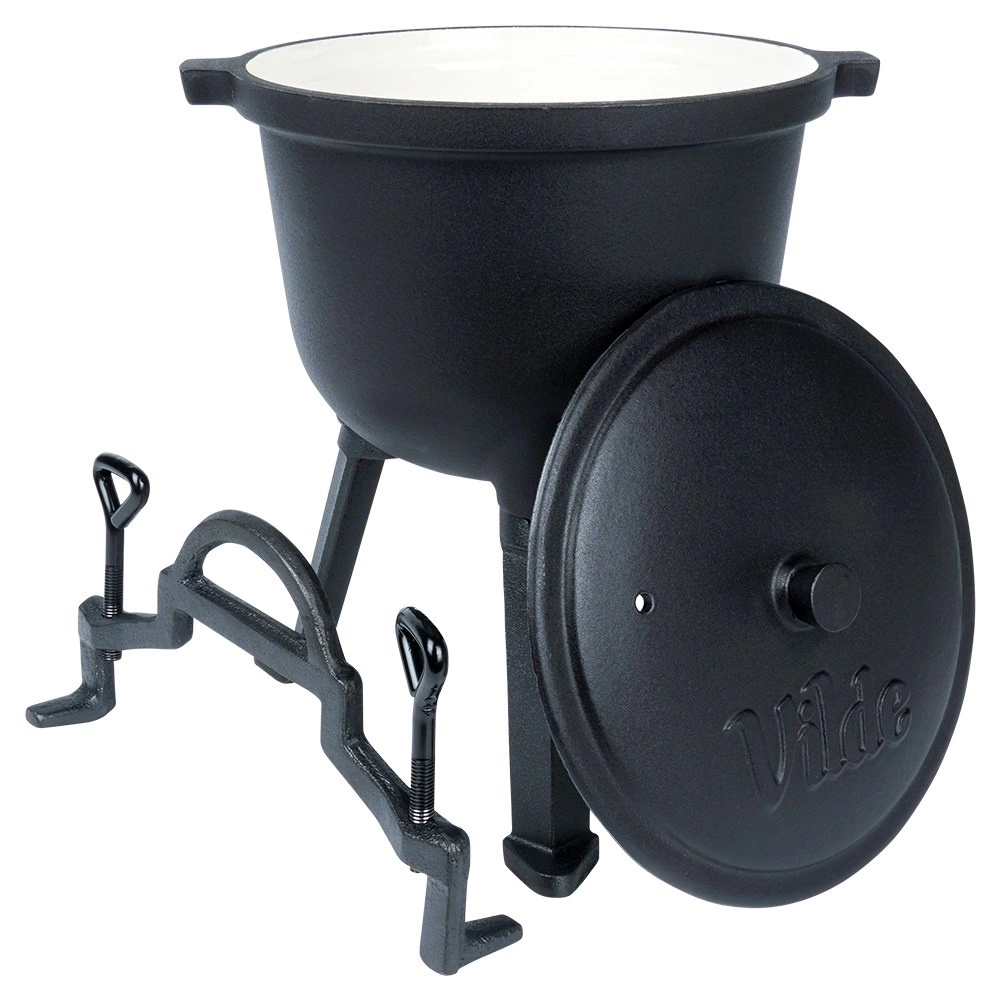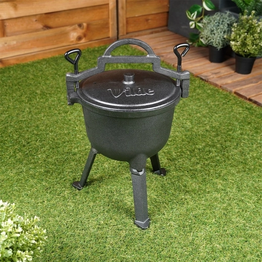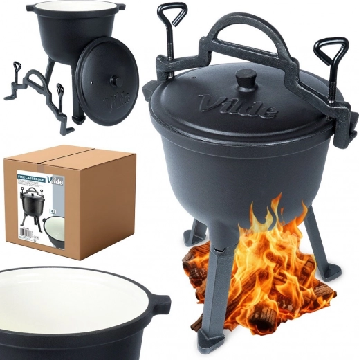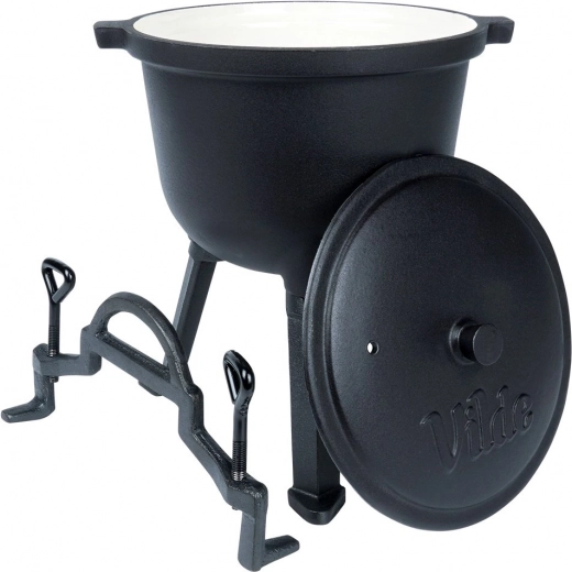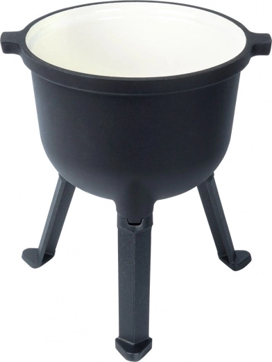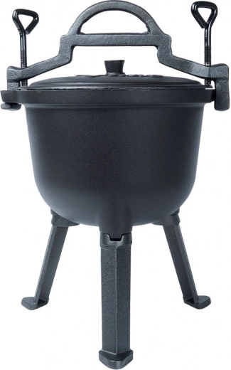 Deze duurzame ketel van zwart gietijzer met een beige geëmailleerde binnenzijde houdt warmte uitstekend vast en geeft die gelijkmatig af, waardoor gerechten sneller gaar worden en sappig en aromatisch blijven. Dankzij de drie stabiele pootjes is hij veilig te gebruiken boven een vuurplaats of gloeiende kolen. Geschikt voor koken, bakken, stoven en braden in de natuur.