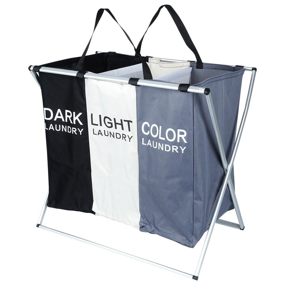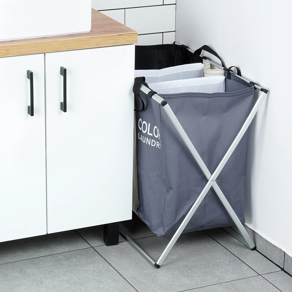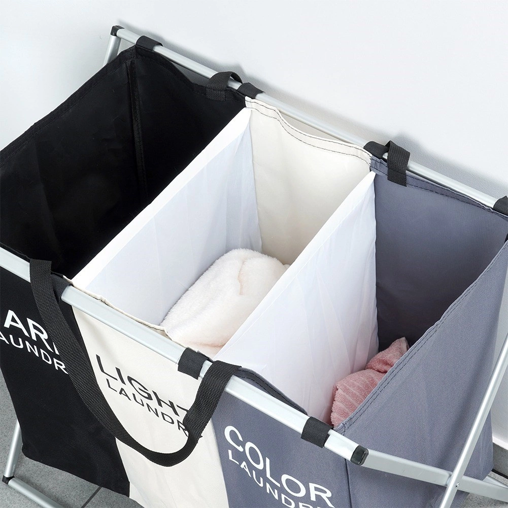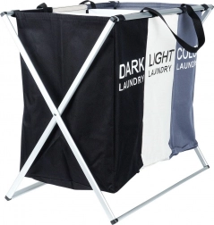Houd overzicht in je was met de duidelijke wasmand met drie compartimenten, waarmee je direct kunt sorteren in donker, licht en kleur. Het lichte maar stabiele metalen frame in zilverkleur en de stevige textielen zakken zorgen voor een lange levensduur en dagelijks gebruiksgemak.