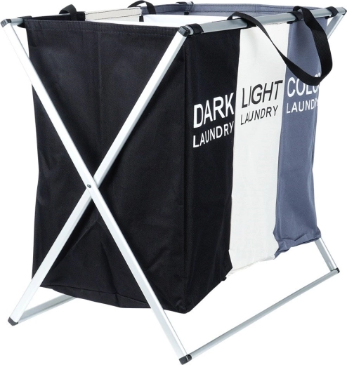 Praktische wasmand met drie compartimenten met een inhoud van 105 l voor het dagelijks sorteren in dark / light / color. Dankzij het stevige metalen frame en de duurzame polyesterstof behoudt hij zijn vorm, is stabiel, opvouwbaar en voorzien van handgrepen voor eenvoudig dragen – ideaal voor badkamer en wasruimte.