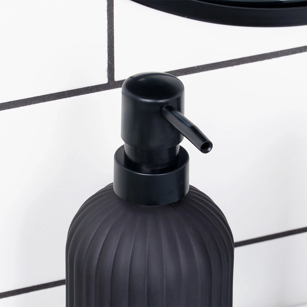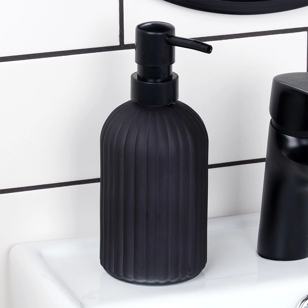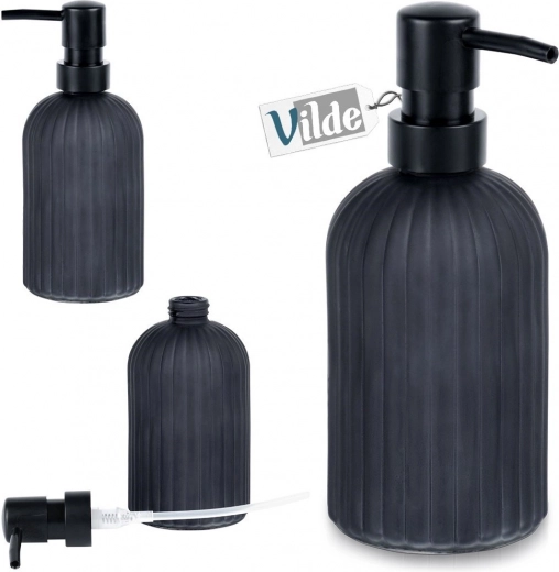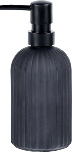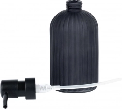 Stijlvolle dispenser voor vloeibare zeep of afwasmiddel, gemaakt van hoogwaardig glas in matzwarte kleur. De geribbelde behuizing ziet er niet alleen geweldig uit, maar zorgt ook voor een antislipgrip. Dankzij de inhoud van 400 ml ideaal voor dagelijks gebruik.