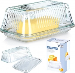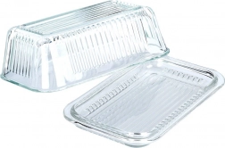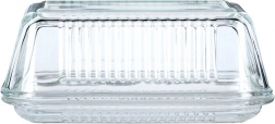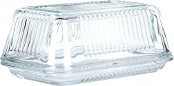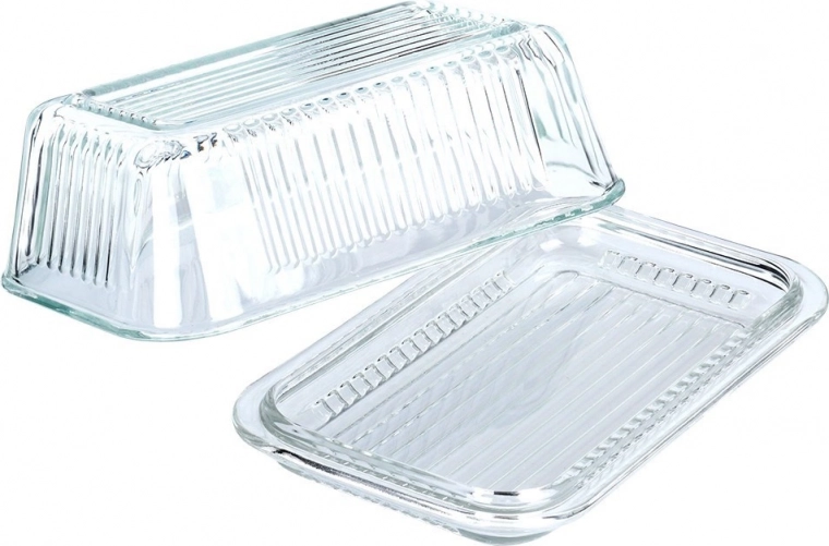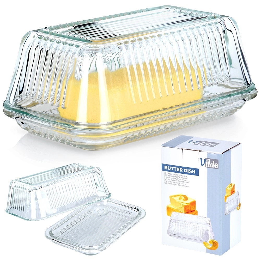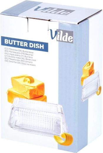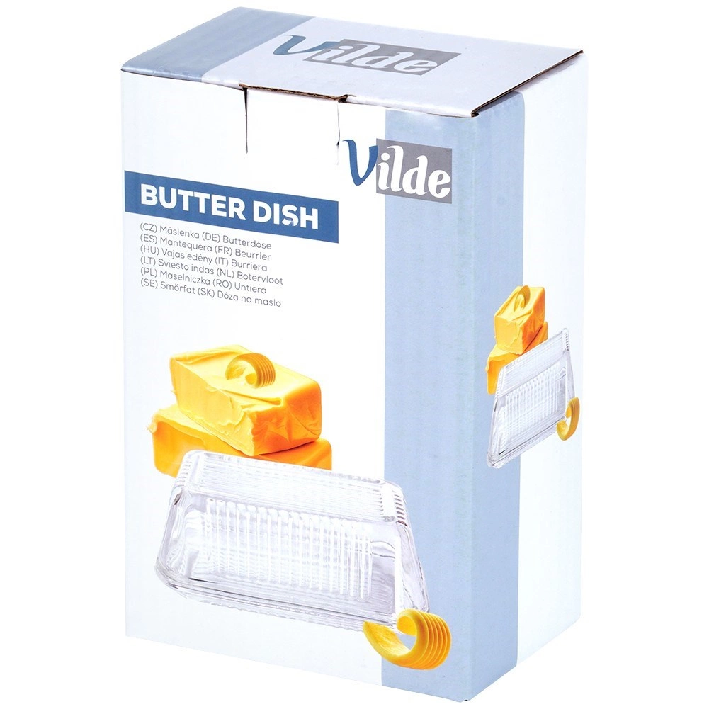 De glazen botervloot Vilde is een stijlvol en praktisch accessoire voor elke keuken. Helder, kwalitatief glas met decoratieve ribbels benadrukt de elegante uitstraling en vergemakkelijkt tegelijk de grip. De klassieke rechthoekige vorm past perfect bij elk servies en maakt het gemakkelijk om boter zowel aan tafel te serveren als overzichtelijk in de koelkast te bewaren.