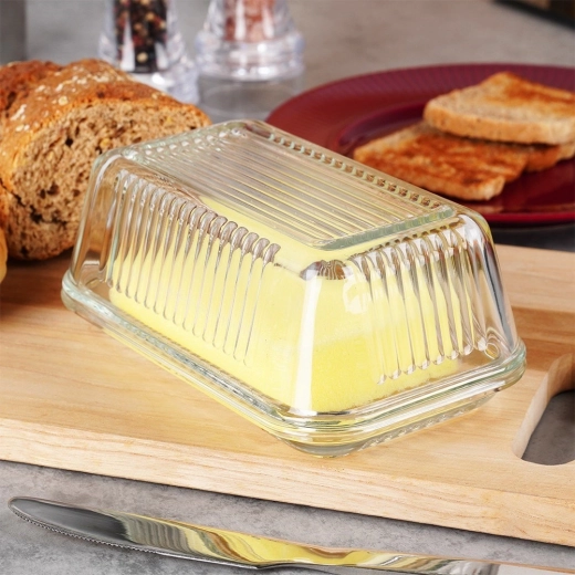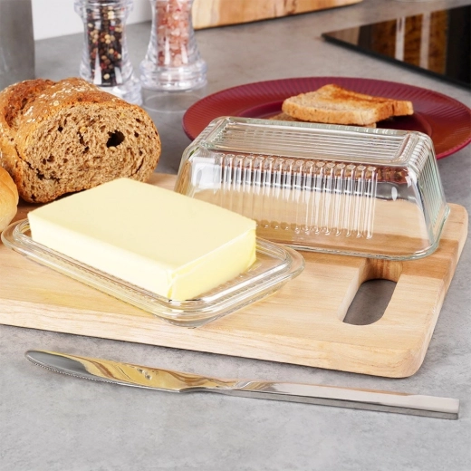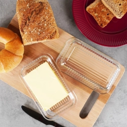 Het precies passende deksel sluit de boter af tegen stof en geuren uit de koelkast, zodat deze langer vers blijft en direct serveerklaar is.