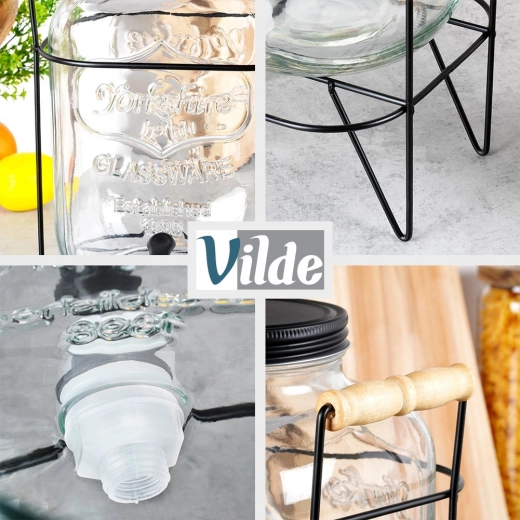 De elegante dispenser van hoogwaardig, dik glas staat prachtig op elke tafel en maakt het bedienen van gasten gemakkelijk. De verhoogde standaard van mat metaal met houten handgrepen biedt ruimte voor glazen onder het kraantje en zorgt voor stabiliteit. Het zwarte schroefdeksel beschermt de drank tegen insecten en vuil.