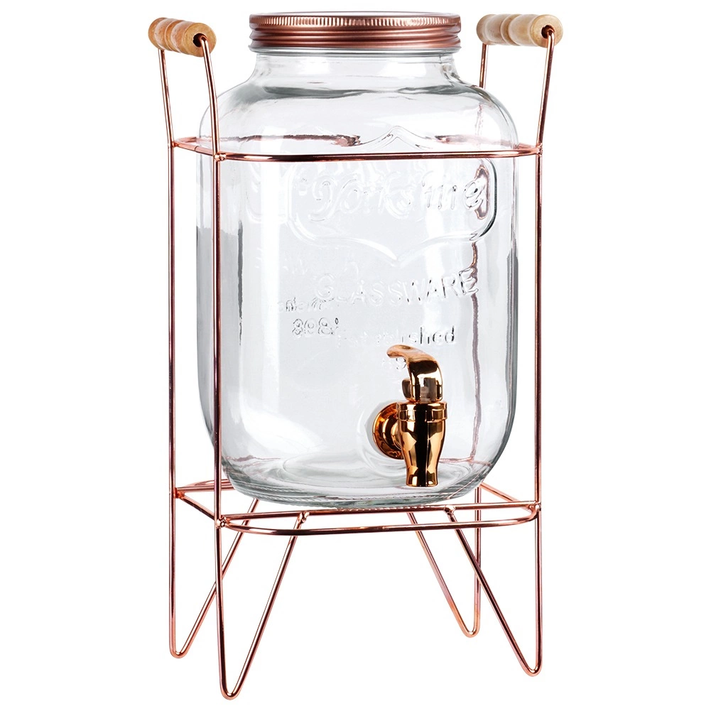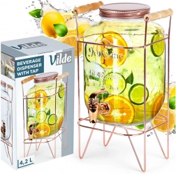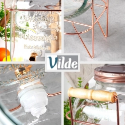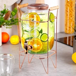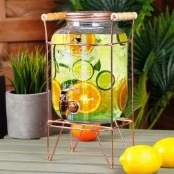 Deze stijlvolle dispenser combineert hoogwaardig dik glas met decoratief embossed reliëf en een metalen standaard in roze-goud met houten handgrepen. De verhoogde positionering zorgt voor comfortabel schenken in glazen zonder de dispenser te hoeven verplaatsen. De metalen schroefdeksel beschermt de inhoud tegen vuil en insecten, waardoor de dispenser perfect is voor zowel buiten als binnen.