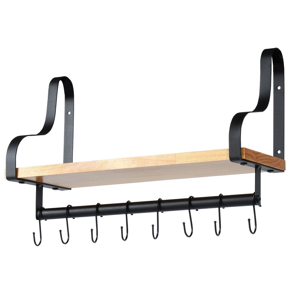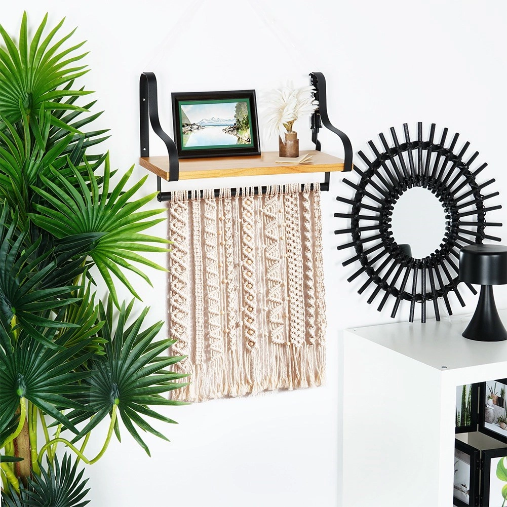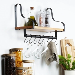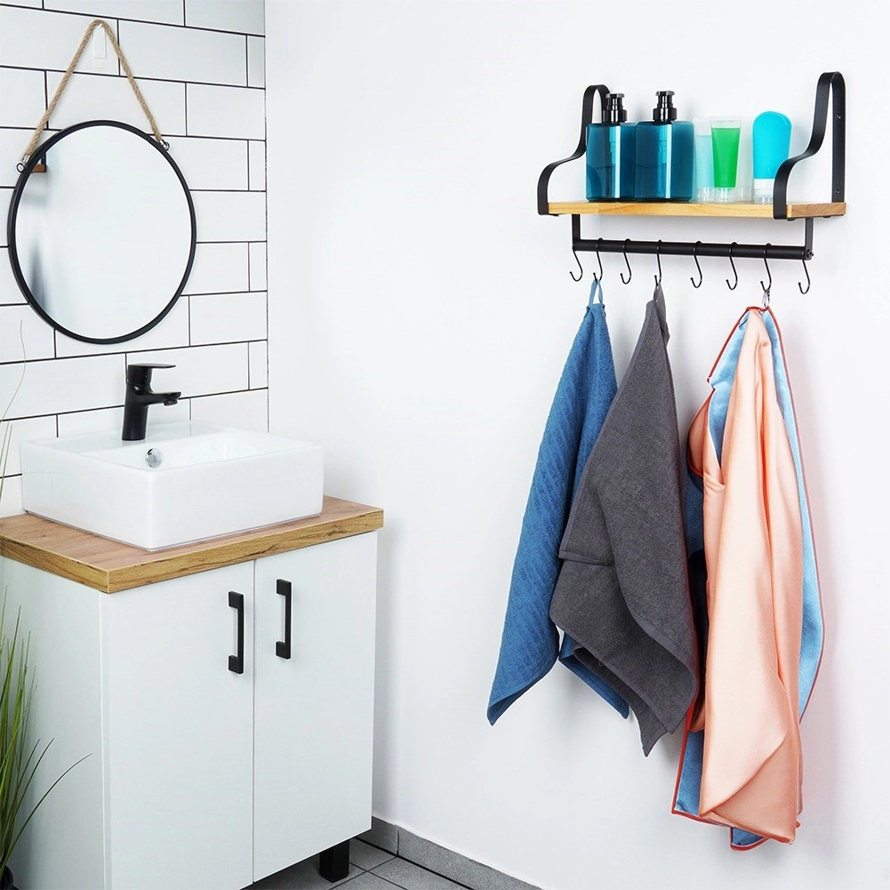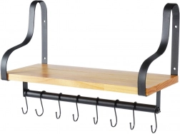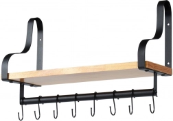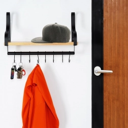 Ontdek een slimme oplossing voor organisatie in huis. Deze wandplank biedt een stabiel aflegvlak van natuurlijk hout en daaronder een handige reling met 8 haken voor het ophangen van mokken, doeken, sleutels of handdoeken. Het minimalistische metalen frame in het zwart benadrukt de moderne industriële look, die gemakkelijk te combineren is met zowel moderne als klassieke interieurs.