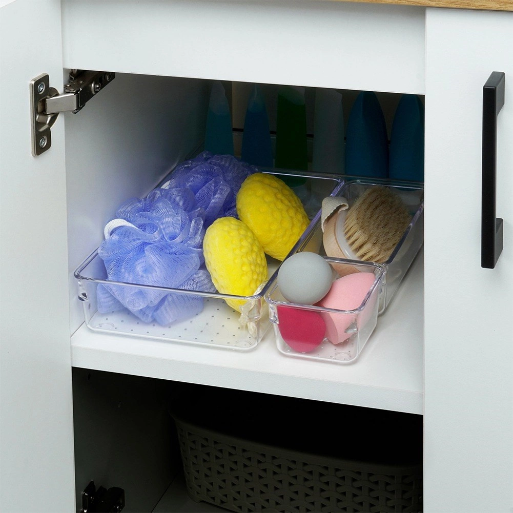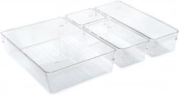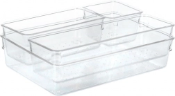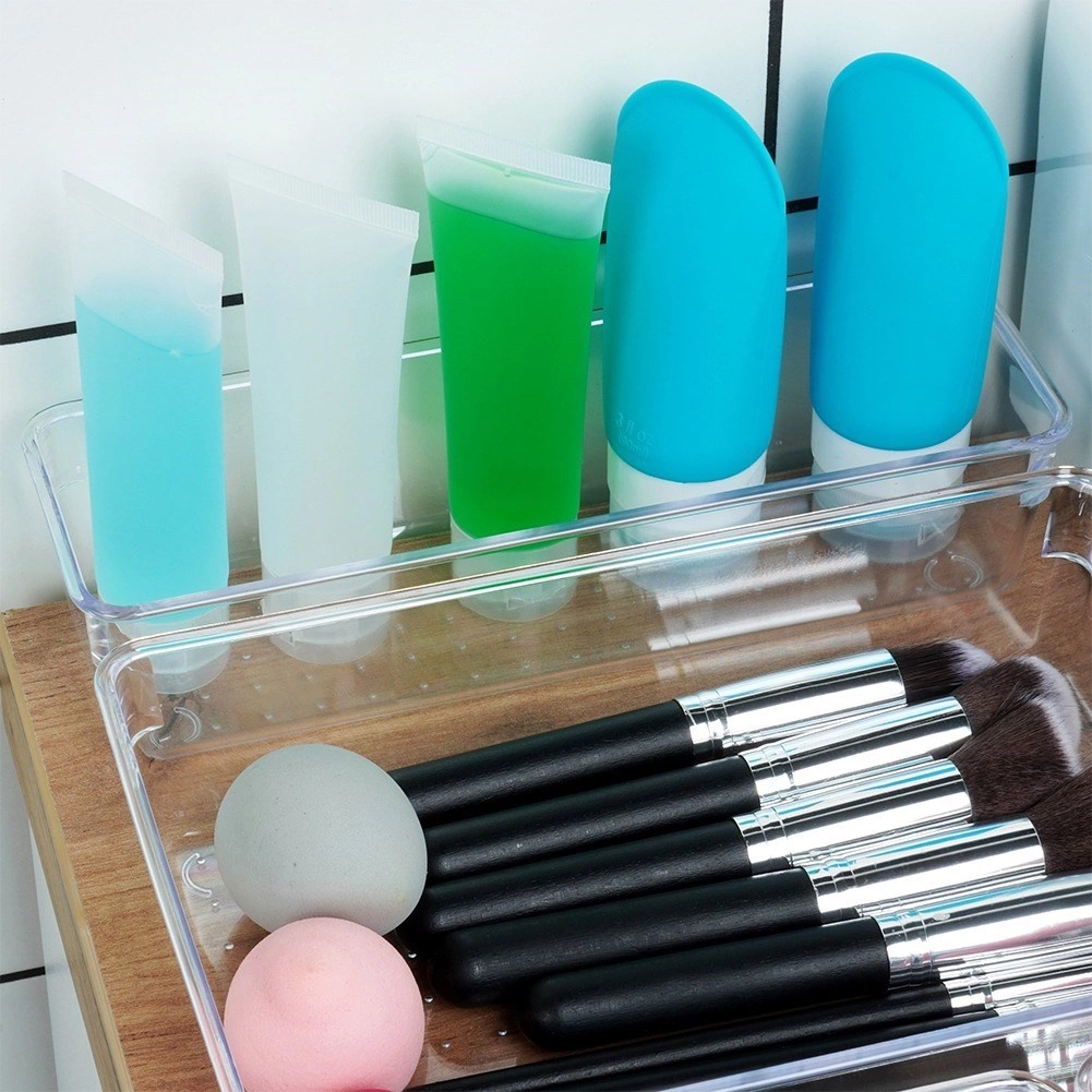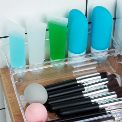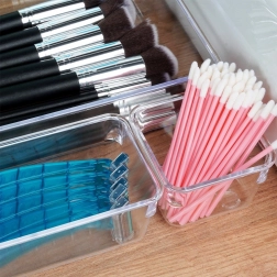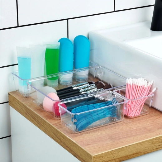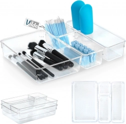 De praktische set van vier transparante organizers van hoogwaardig acryl brengt orde in badkamer, slaapkamer en inloopkast. Dankzij de verschillende afmetingen scheid je eenvoudig kwasten, sponsjes, wattenstaafjes, sieraden of nagelaccessoires. Transparante wanden zorgen voor overzicht en snelle toegang tot de inhoud, terwijl het elegante uiterlijk perfect past bij zowel moderne als klassieke interieurs.