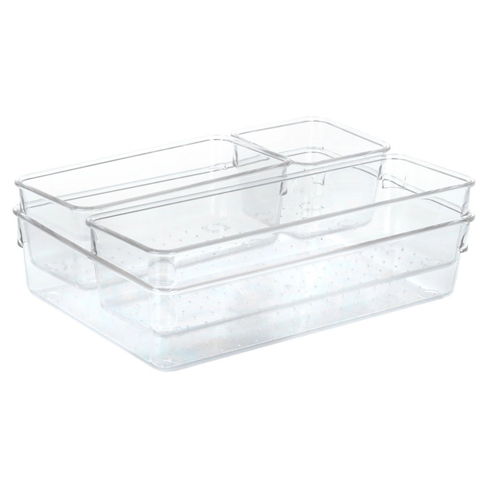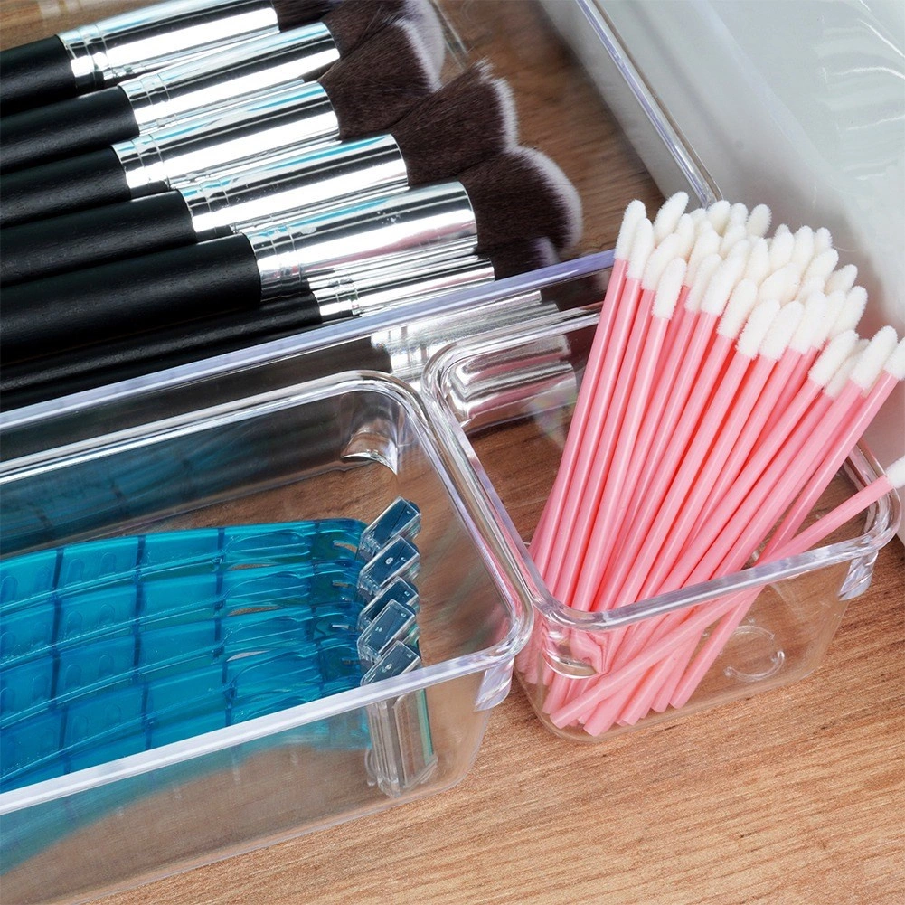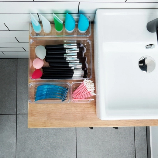 Vier losse bakjes in verschillende afmetingen combineer je eenvoudig in de lade of op het blad. Rangschik kwasten, wattenstaafjes, accessoires en cosmetica precies naar jouw wensen.