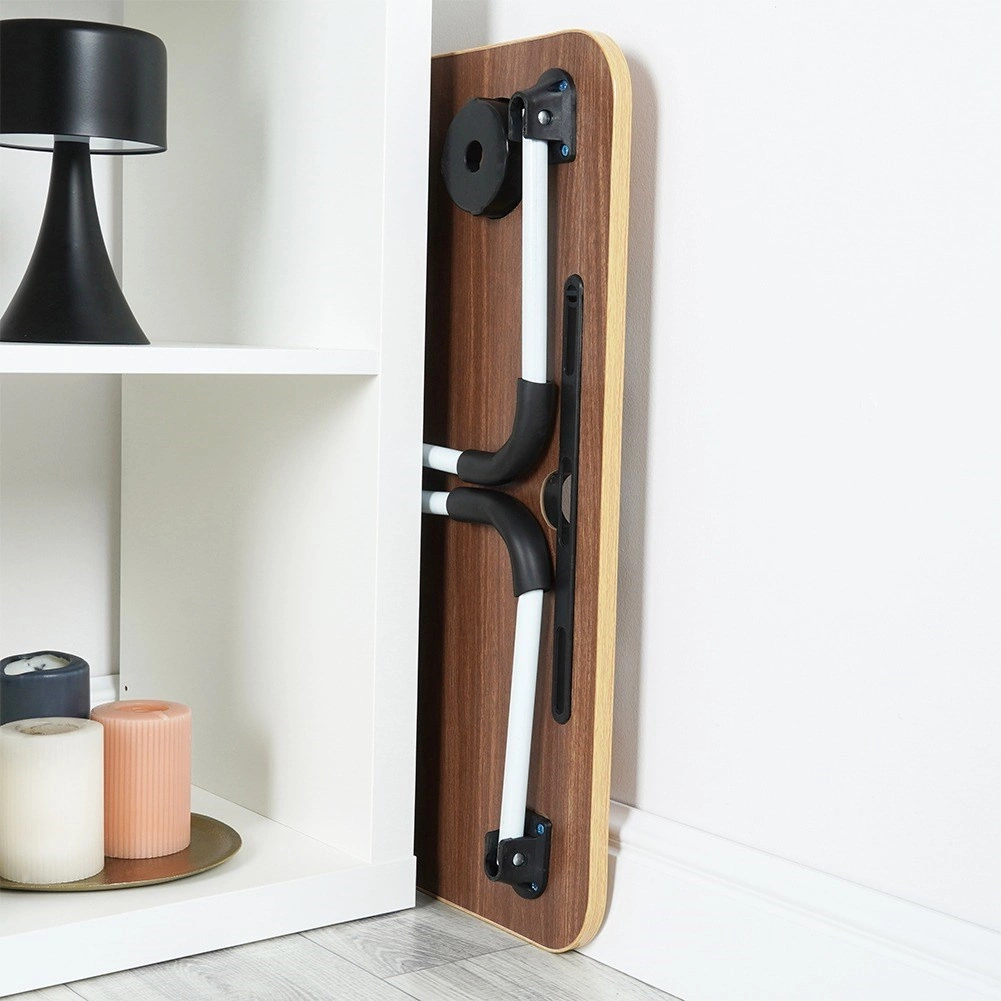 Het metalen frame in het wit met antislipdoppen zorgt voor stabiliteit, terwijl het lichte MDF-blad in licht houtdecor prettig aanvoelt en eenvoudig te reinigen is. De tafel is snel plat op te vouwen voor ruimtebesparende opslag achter de kast of onder het bed.