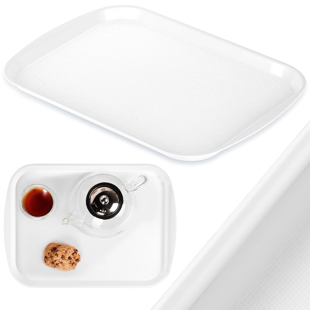 Universeel serveerblad in een elegante witte kleur dat het serveren van koffie, thee, desserts en kant-en-klare gerechten vergemakkelijkt. Licht, maar stevig kunststof is bestand tegen dagelijks gebruik thuis, op kantoor en in HoReCa-omgevingen. Dankzij het formaat van 43,5 × 31,5 cm is er voldoende ruimte voor borden, glazen en kannen.