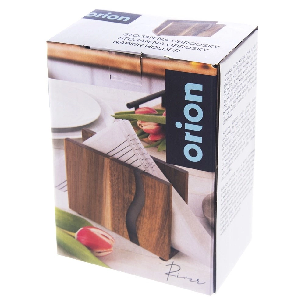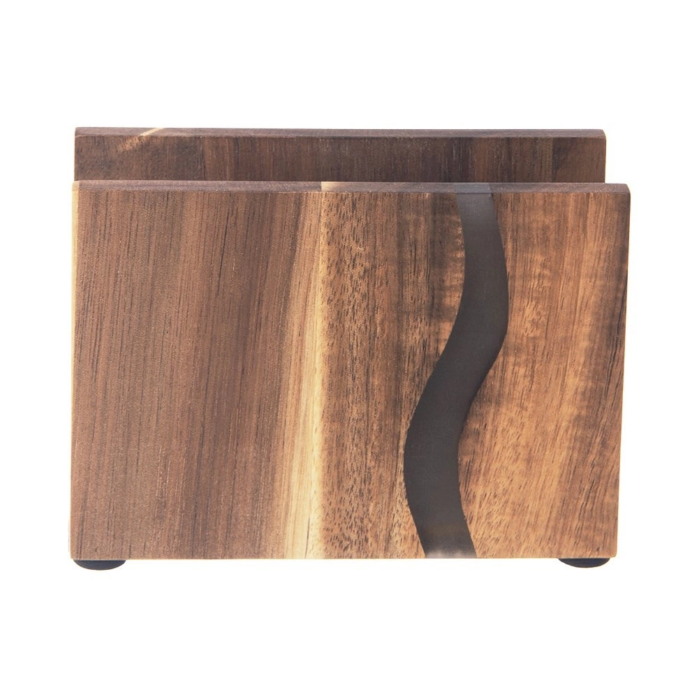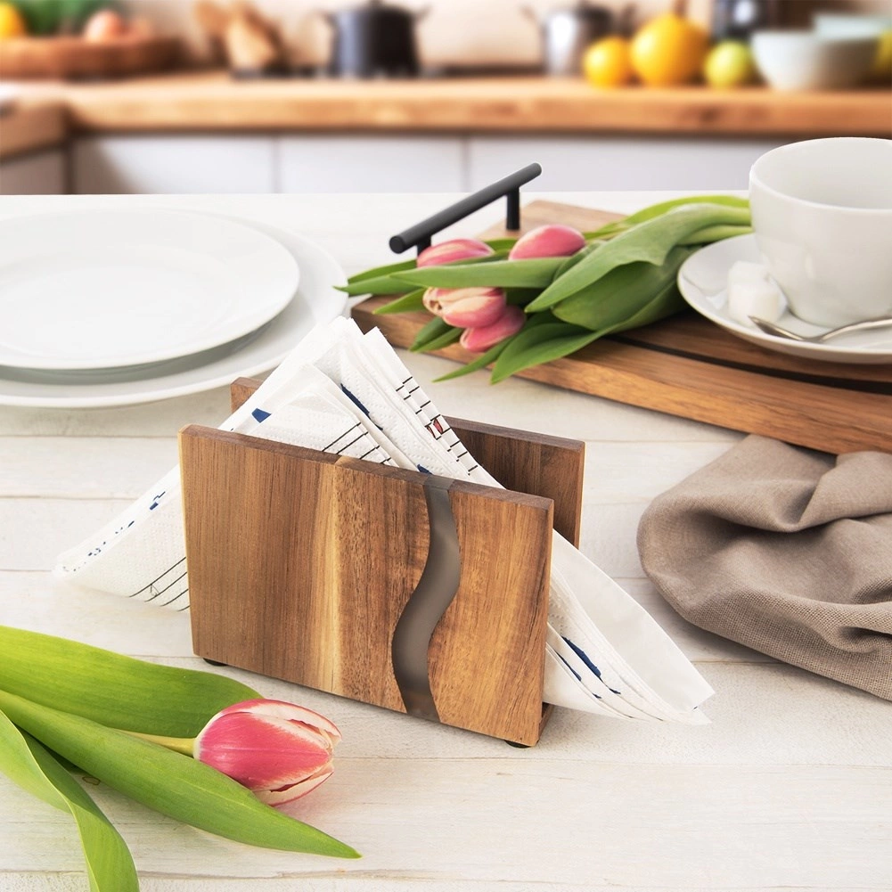 Elegante en praktische houten servethouder van acaciahout met een stijlvol harsaccent in de vorm van een rivier. Houdt servetten overzichtelijk op hun plek, is stabiel, beschermt de tafel dankzij vilten voetjes en past perfect in huis en in de horeca.