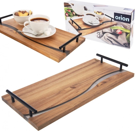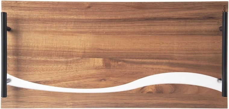 Stijlvolle serveerplank van acaciahout met stabiele metalen handgrepen en decoratieve hars met een “rivier”-look. Ideaal voor het serveren van koffie, thee, desserts en snacks thuis en in de horeca. Afmetingen 42 × 20 × 4,5 cm (hoogte zonder handgrepen 1,5 cm). Stevige afwerking, prettig glad oppervlak en industriële LOFT-stijl maken het tot een opvallend accessoire én een praktische hulp.