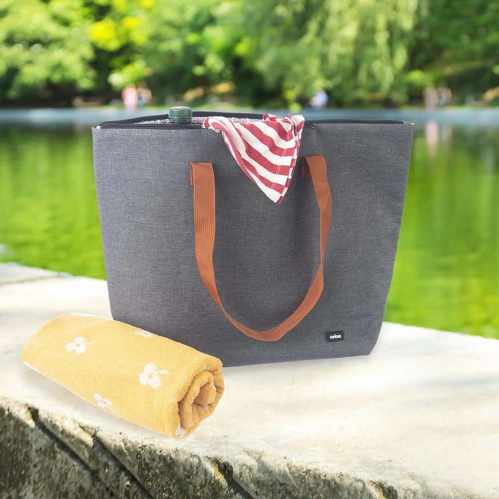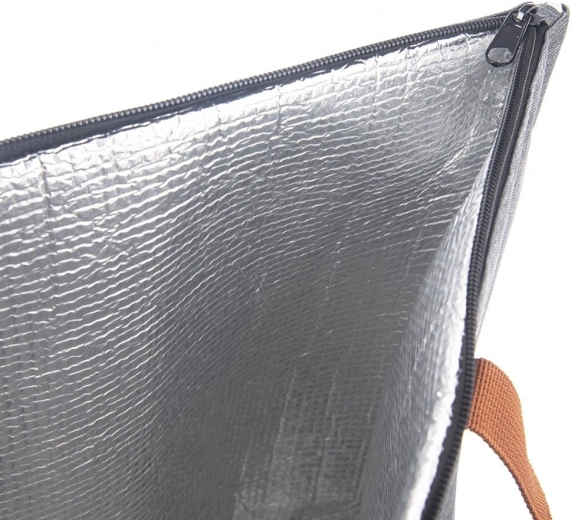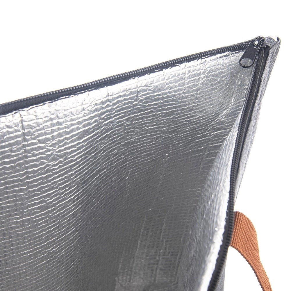 De tas is gemaakt van sterke polyestertwill die slijtvast is. Het grijze lichaam wordt aangevuld met bruine riemen van circa 30 cm voor comfortabel dragen in de hand of over de schouder. Perfect voor strand, picknick, boodschappen en reizen – houdt in de zomer drankjes en snacks koel en helpt in de winter het eten warm te houden.