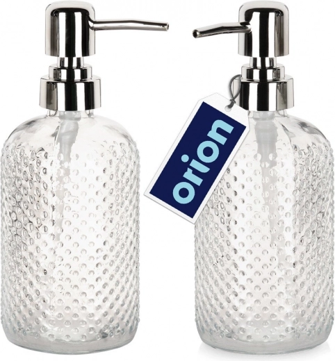 Elegante glazen zeepdispenser met een inhoud van 430 ml, gemaakt van hoogwaardig helder glas met decoratief reliëf en een zilverkleurige pomp. Past perfect in zowel de badkamer als de keuken, biedt comfortabel bijvullen, niveauregeling dankzij het transparante lichaam en zorgt voor een modern design en praktische, hygiënische dosering van vloeibare zeep of afwasmiddel.