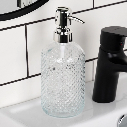 Deze stijlvolle dispenser combineert transparant, hoogwaardig glas met een decoratieve textuur voor een zekere grip en een duurzame pomp in een elegante zilverkleurige uitvoering. Dankzij de inhoud van 430 ml is hij ideaal voor dagelijks gebruik in zowel badkamer als keuken en houdt hij je ruimte schoon en georganiseerd.