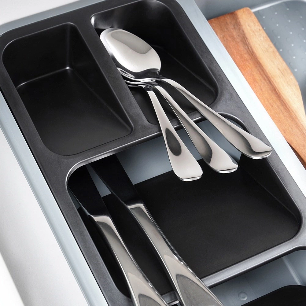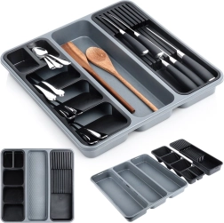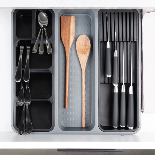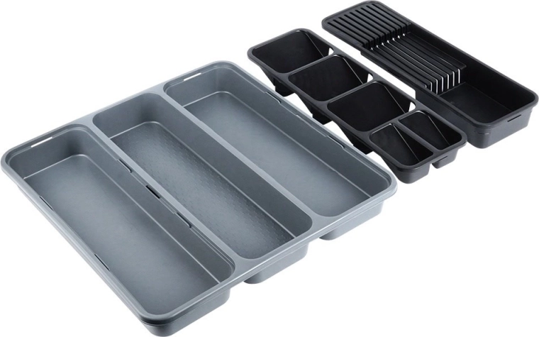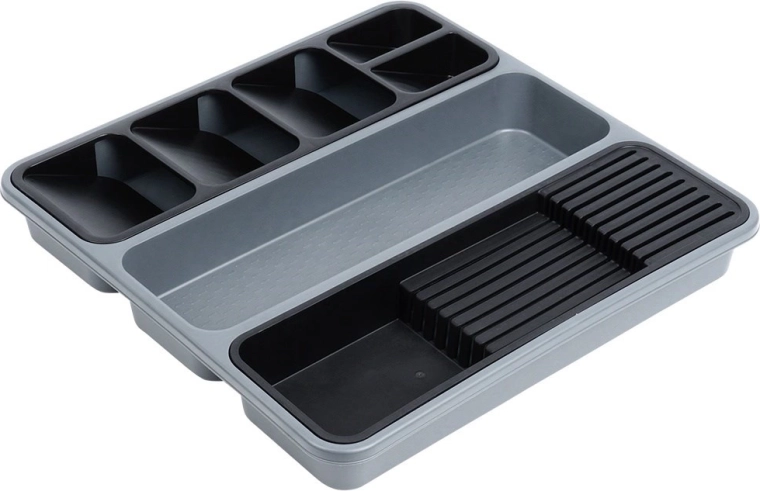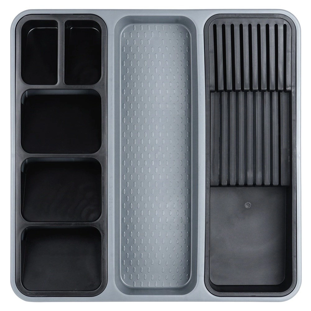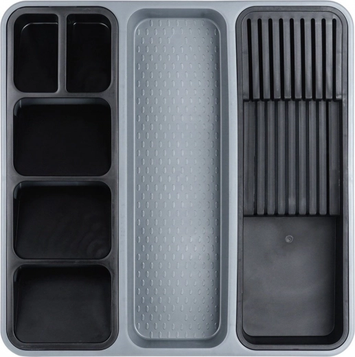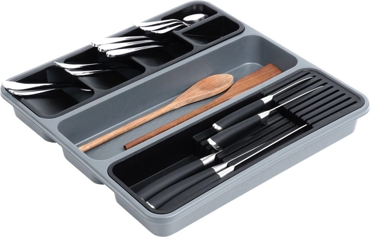 Orden je keuken in een handomdraai. Deze grijze organizer met afmetingen 40 × 40 × 5 cm biedt een slimme indeling van vakken inclusief uitneembare inzetstukken – één geschikt voor tot 9 messen, de andere voor overzichtelijke sortering van bestek. Zo blijft elk item op zijn plek en is je lade altijd netjes.