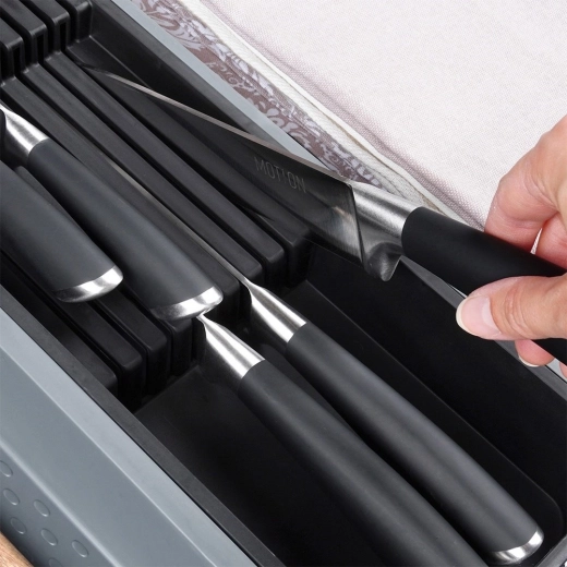 Het speciale blok met aparte sleuven houdt messen gescheiden, beschermd en altijd paraat. Bespaart ruimte en verhoogt de veiligheid in de lade.