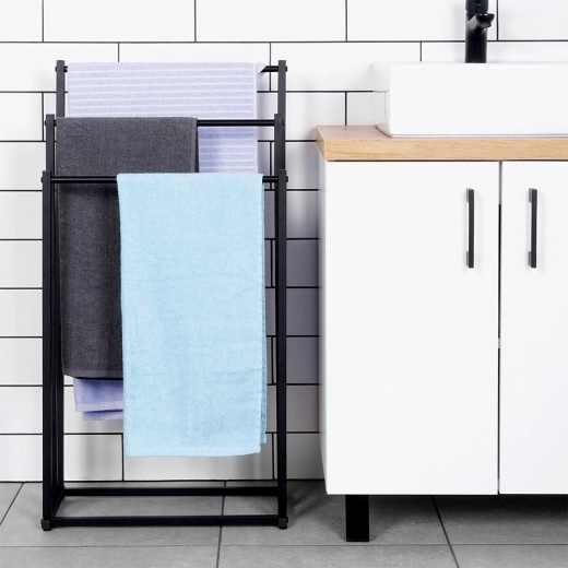Praktische vrijstaande handdoeken- of kledingstandaard met drie getrapt geplaatste stangen voor overzichtelijke opslag en betere luchtcirculatie voor snellere droging. Het minimalistische design in mat zwart past perfect bij moderne interieurs en geeft de badkamer een industriële uitstraling.