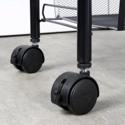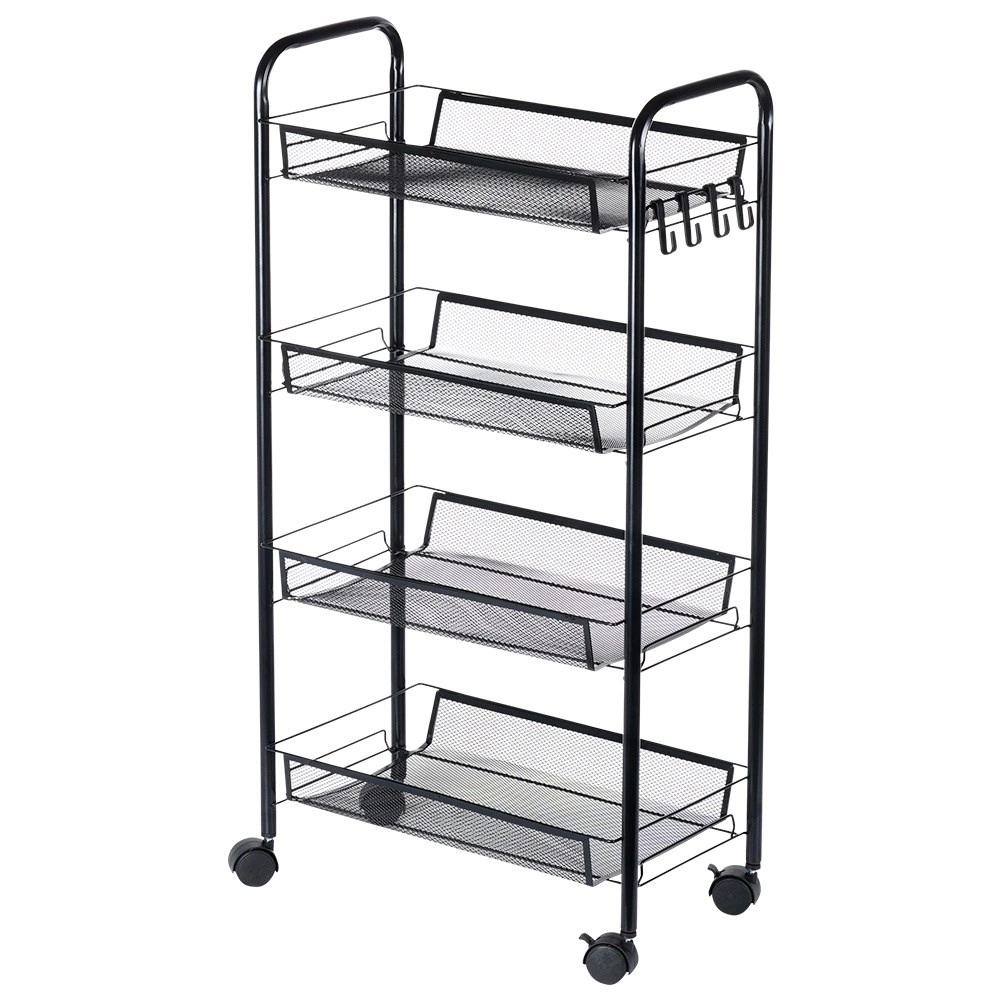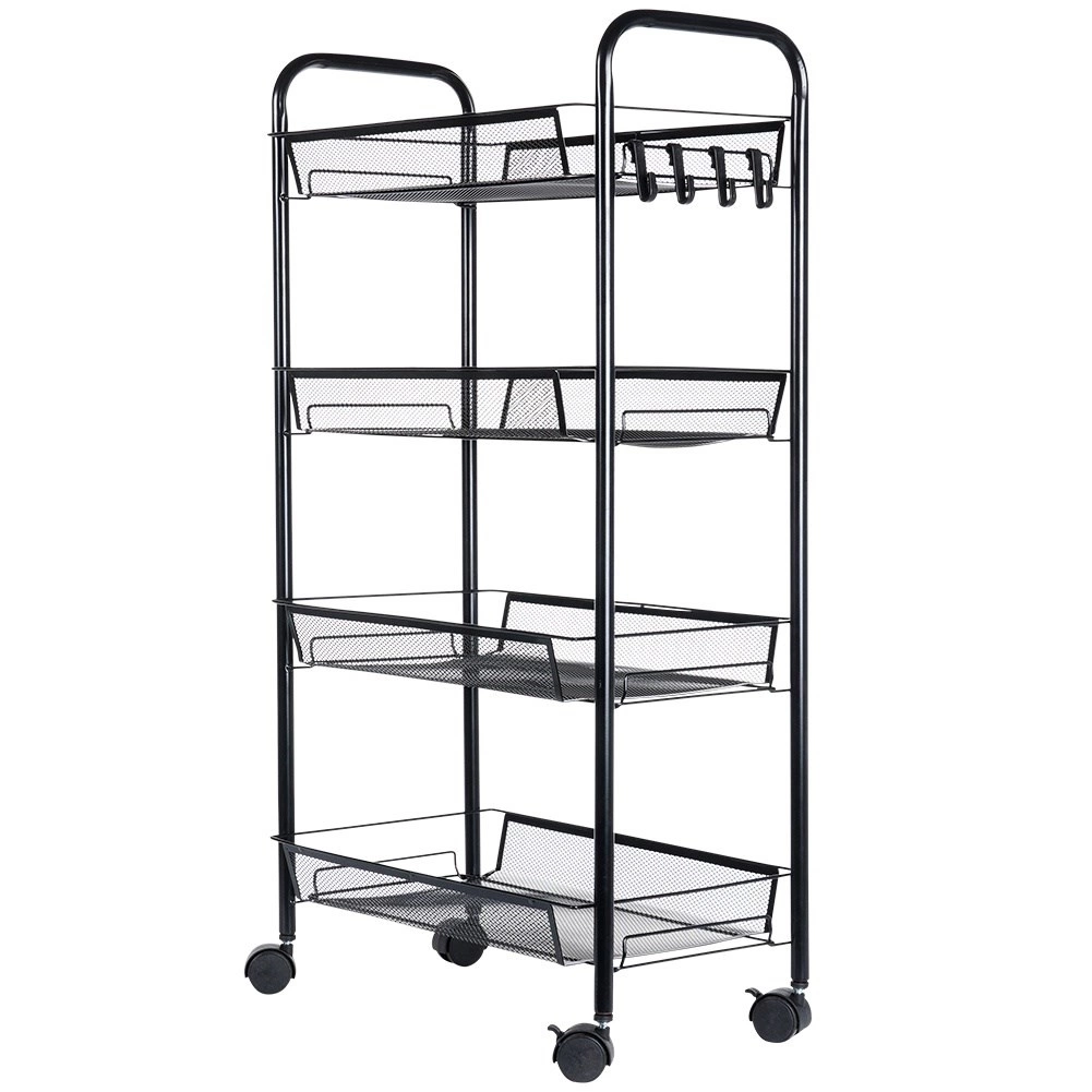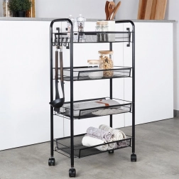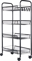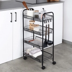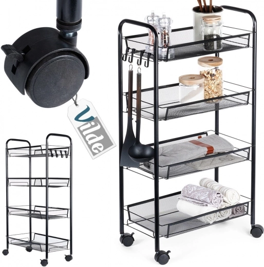 Smal en handzaam hulpmiddel voor dagelijkse orde. Het metalen rek met 4 manden benut de verticale ruimte efficiënt, zodat je zelfs op een kleine oppervlakte etenswaren, cosmetica, schoonmaakmiddelen, handdoeken of kantoorspullen kunt opbergen. Dankzij de zwenkwielen verplaats je het eenvoudig naar waar het nodig is, en twee vergrendelingen zorgen voor een stabiele positie.