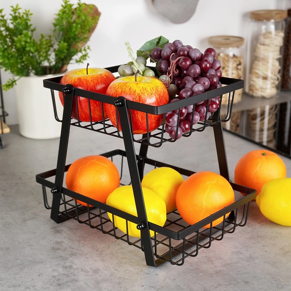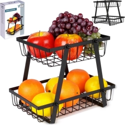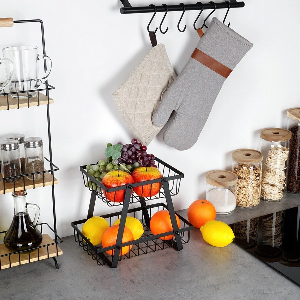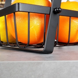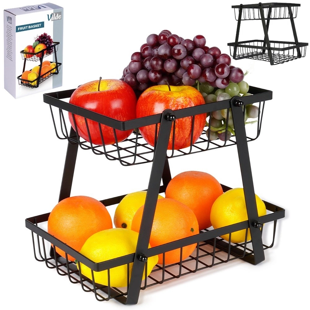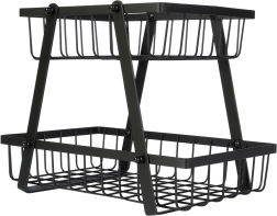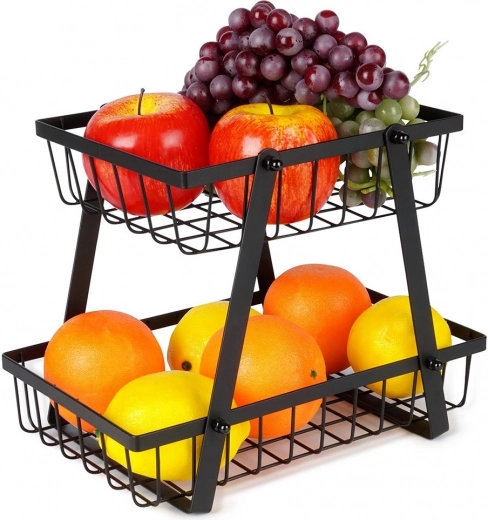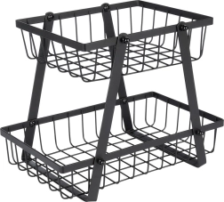 Een stijlvolle en praktische hulp in elke keuken: de tweelaagse standaard met draadmanden in industriële loft-stijl bespaart ruimte en presenteert je fruit en groenten prachtig. De open zijkanten bevorderen de luchtstroom, zodat producten langer vers blijven en zichtbaar zijn.