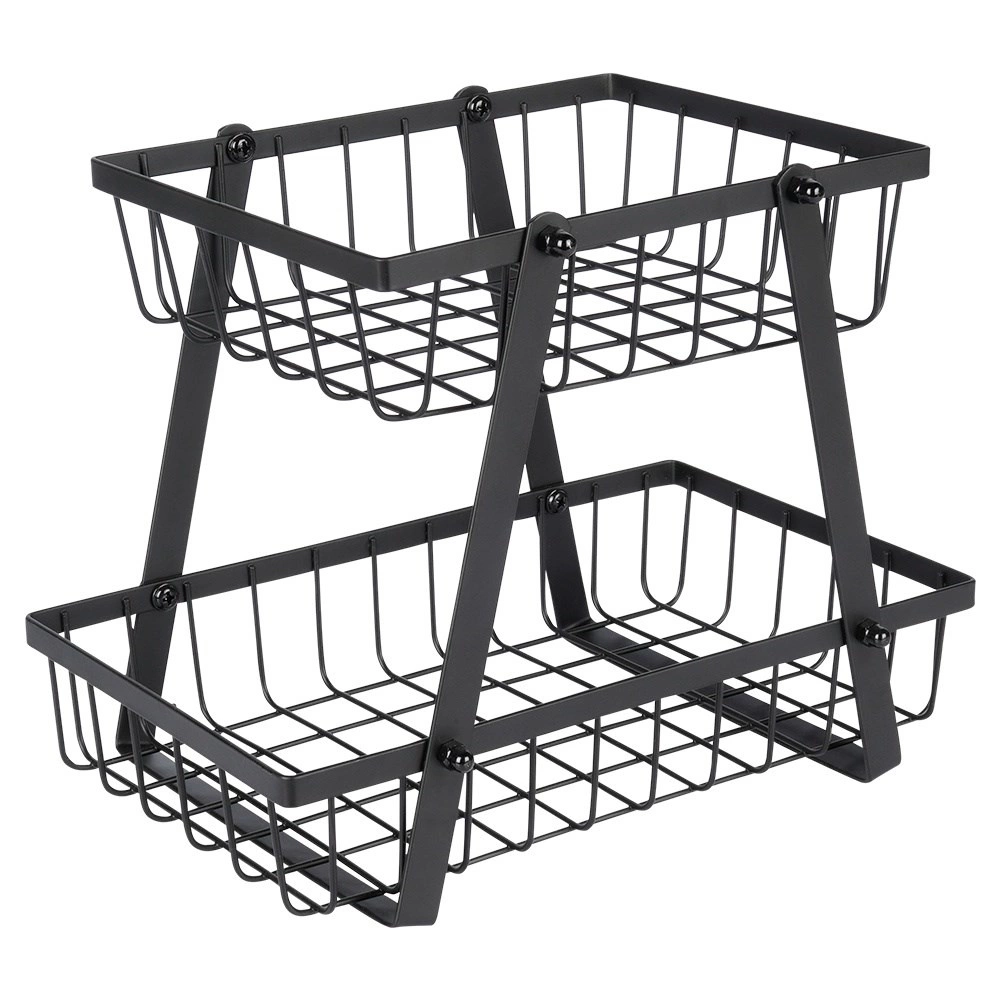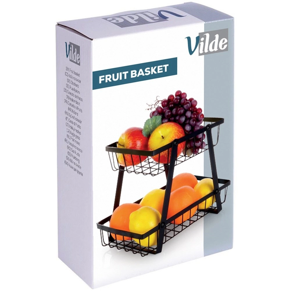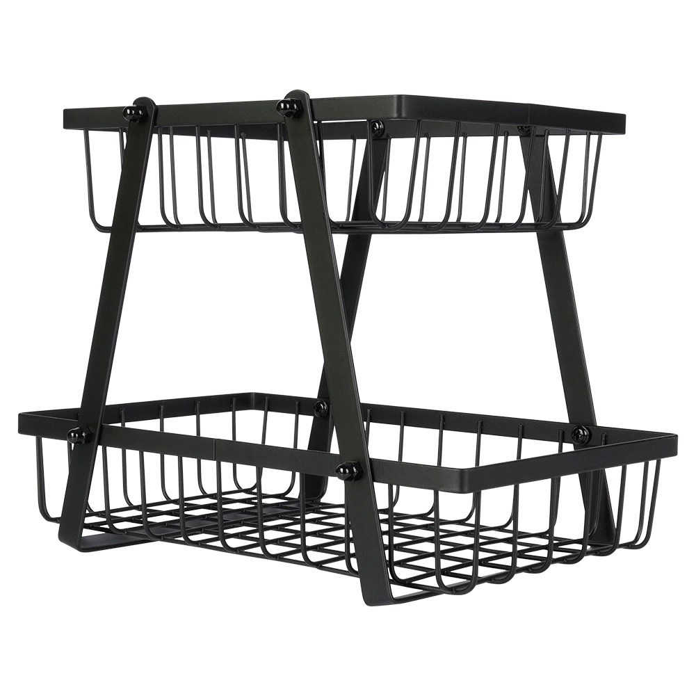 Een stijlvolle en praktische hulp in elke keuken: de tweelaagse standaard met draadmanden in industriële loft-stijl bespaart ruimte en presenteert je fruit en groenten prachtig. De open zijkanten bevorderen de luchtstroom, zodat producten langer vers blijven en zichtbaar zijn.
