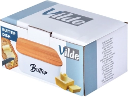 Elegante witte botervloot van staal met een natuurlijk bamboe deksel houdt boter langer vers en serveert het stijlvol op tafel. Ideaal voor in de koelkast en voor het serveren. Afmetingen 15 × 10 × 7,5 cm. Duurzaam staal, praktisch deksel, makkelijk schoon te maken en tijdloos design met het opschrift “Butter”. Origineel VILDE-product.
